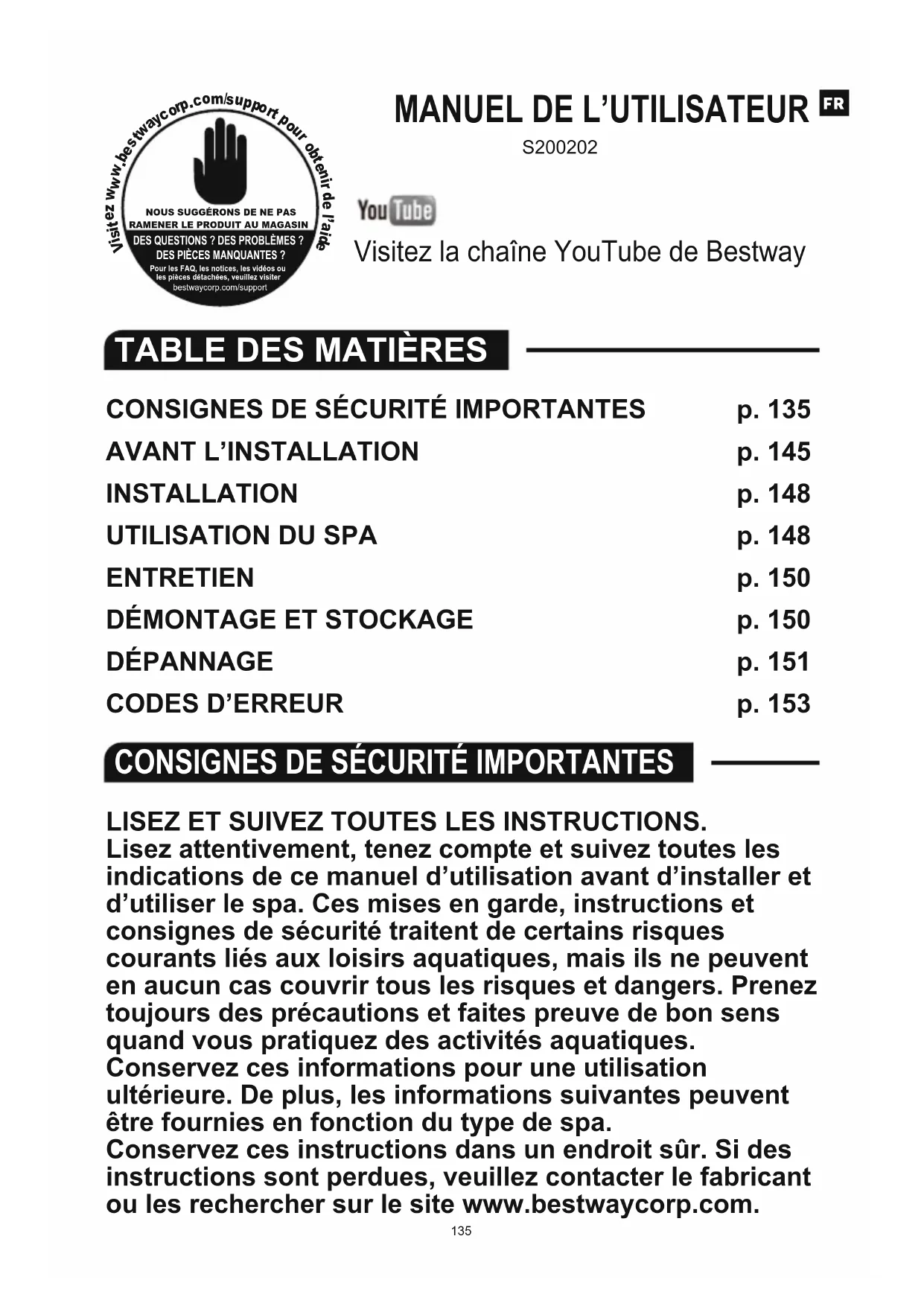 www.bestwaycorp.com. Rilevata corrente nell’impianto di messa a terraCONSIGNES DE SÉCURITÉ IMPORTANTES LISEZ ET SUIVEZ TOUTES LES INSTRUCTIONS. Lisez attentivement, tenez compte et suivez toutes les indications de ce manuel d’utilisation avant d’installer et d’utiliser le spa. Ces mises en garde, instructions et consignes de sécurité traitent de certains risques courants liés aux loisirs aquatiques, mais ils ne peuvent en aucun cas couvrir tous les risques et dangers. Prenez toujours des précautions et faites preuve de bon sens quand vous pratiquez des activités aquatiques. Conservez ces informations pour une utilisation ultérieure. De plus, les informations suivantes peuvent être fournies en fonction du type de spa. Conservez ces instructions dans un endroit sûr. Si des instructions sont perdues, veuillez contacter le fabricant ou les rechercher sur le site www.bestwaycorp.com.