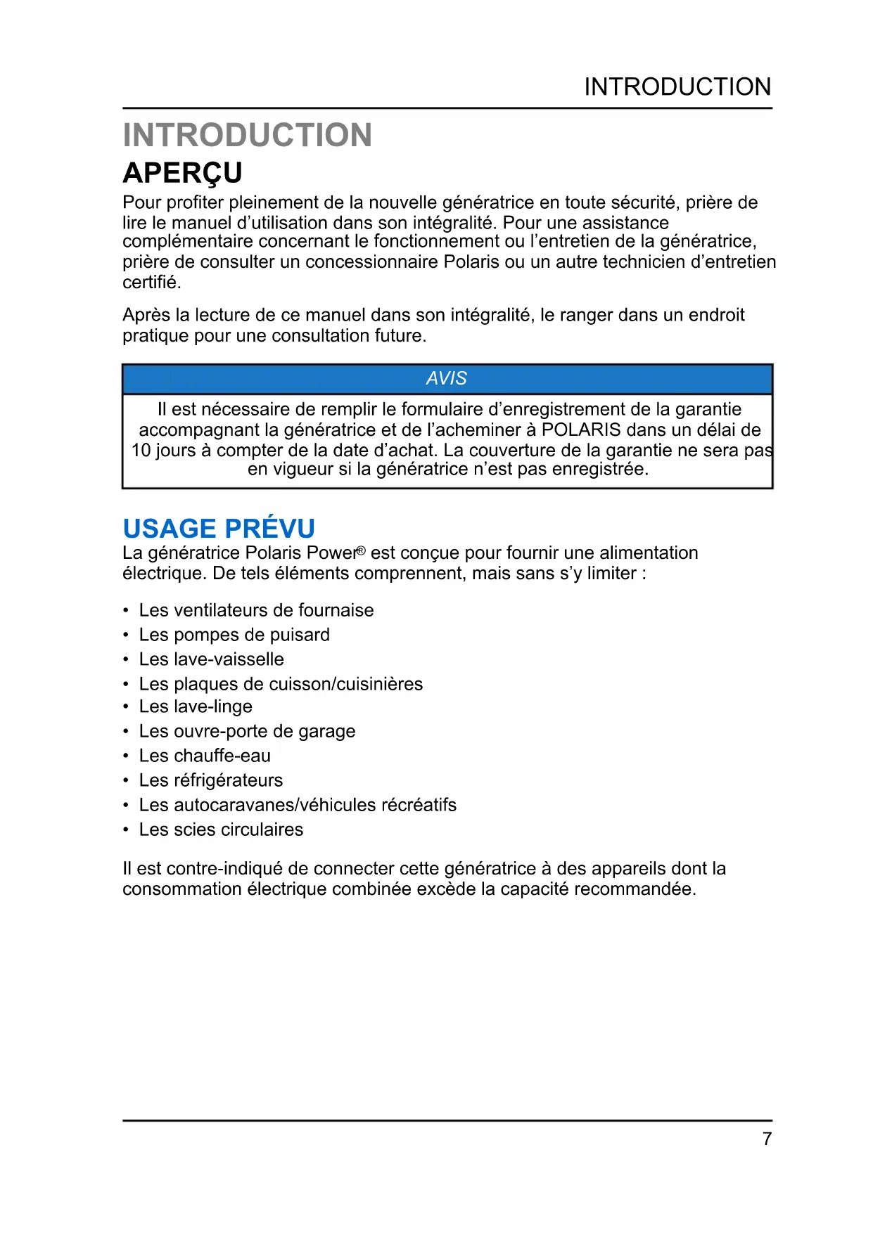 - Registre d’entretien 56INTRODUCTION APERÇU Pour profiter pleinement de la nouvelle génératrice en toute sécurité, prière de lire le manuel d’utilisation dans son intégralité. Pour une assistance complémentaire concernant le fonctionnement ou l’entretien de la génératrice, prière de consulter un concessionnaire Polaris ou un autre technicien d’entretien certifié. Après la lecture de ce manuel dans son intégralité, le ranger dans un endroit pratique pour une consultation future. AVIS Il est nécessaire de remplir le formulaire d’enregistrement de la garantie accompagnant la génératrice et de l’acheminer à POLARIS dans un délai de 10 jours à compter de la date d’achat. La couverture de la garantie ne sera pas en vigueur si la génératrice n’est pas enregistrée. p. 125