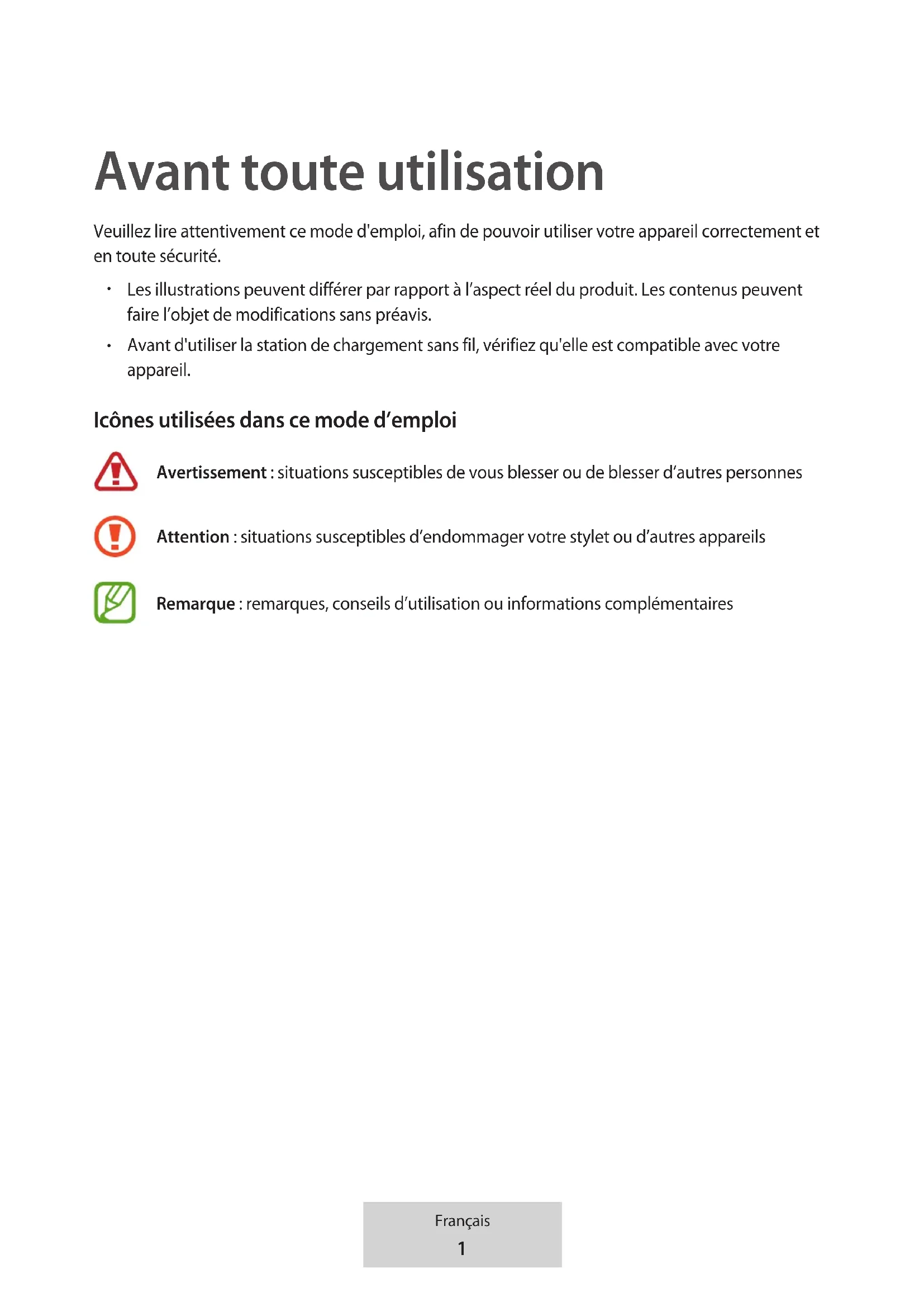 Avant d'utiliser la station de chargement sans fil, vérifiez qu'elle est compatible avec votre appareil. Icônes utilisées dans ce mode d’emploi