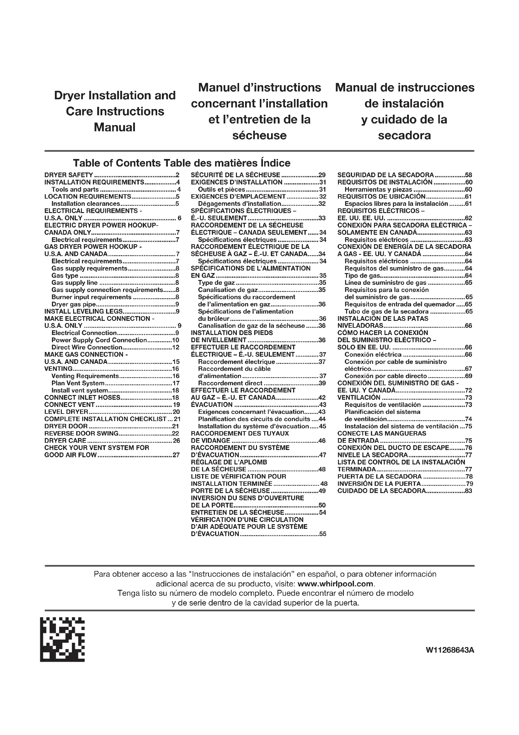 IMPORTANT : L’installation au gaz doit être conforme aux codes locaux, ou en l’absence de codes locaux, au Code National d’alimentation au gaz, à la norme ANSI Z223.1/NFPA 54 ou au Code des installations au gaz naturel et au propane, CSA-B149.1. La sécheuse doit être correctement reliée à la terre en conformité avec les codes locaux en vigueur, ou en l’absence de tels codes, avec le National Electrical Code, ANSI/NFPA 70 ou le Code canadien des installations électriques, CSA C22.1 partie 1. Risque possible de décès ou de blessure grave si vous ne suivez pas immédiatement les instructions. Risque possible de décès ou de blessure grave si vous ne suivez pas les instructions. Tous les messages de sécurité vous diront quel est le danger potentiel et vous disent comment réduire le risque de blessure et ce qui peut se produire en cas de non-respect des instructions. Votre sécurité et celle des autres est très importante. Nous donnons de nombreux messages de sécurité importants dans ce manuel et sur votre appareil ménager. Assurez-vous de toujours lire tous les messages de sécurité et de vous y conformer. AVERTISSEMENT DANGER Voici le symbole d’alerte de sécurité. Ce symbole d’alerte de sécurité vous signale les dangers potentiels de décès et de blessures graves à vous et à d’autres. Tous les messages de sécurité suivront le symbole d’alerte de sécurité et le mot “DANGER” ou “AVERTISSEMENT”. Ces mots signifient :30 Dans l’État du Massachusetts, les instructions d’installation suivantes sont applicables : Les travaux d’installation et réparation doivent être exécutés par un plombier ou tuyauteur qualifié ou licencié, ou par le personnel qualifié d’une entreprise licenciée par l’État du Massachusetts. Remplacer par des dispositifs de fermeture acceptables : Les robinets de gaz et robinets à bille installés pour l'utilisation devraient être indiqués. Si un conduit de raccordement flexible est utilisé, sa longueur ne doit pas dépasser 4 pi (121,9 cm).31