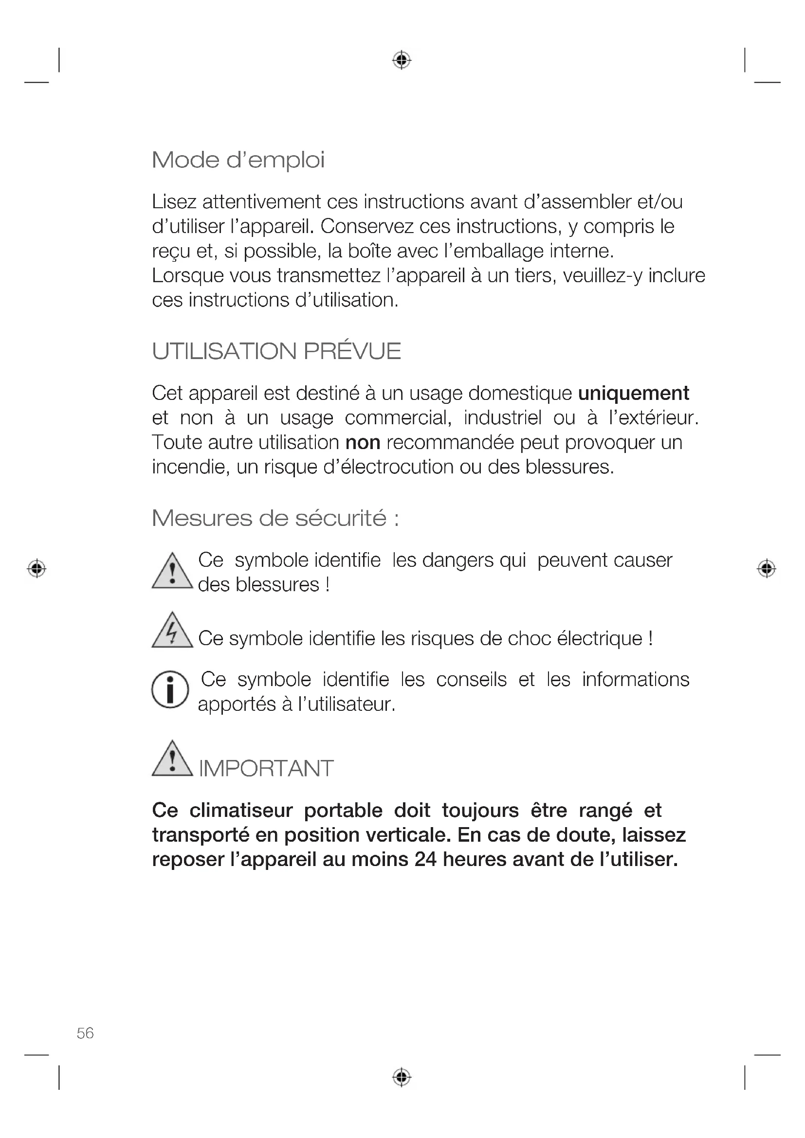 Ce climatiseur portable doit toujours être rangé et transporté en position verticale. En cas de doute, laissez reposer l'appareil au moins 24 heures avant de l'utiliser.