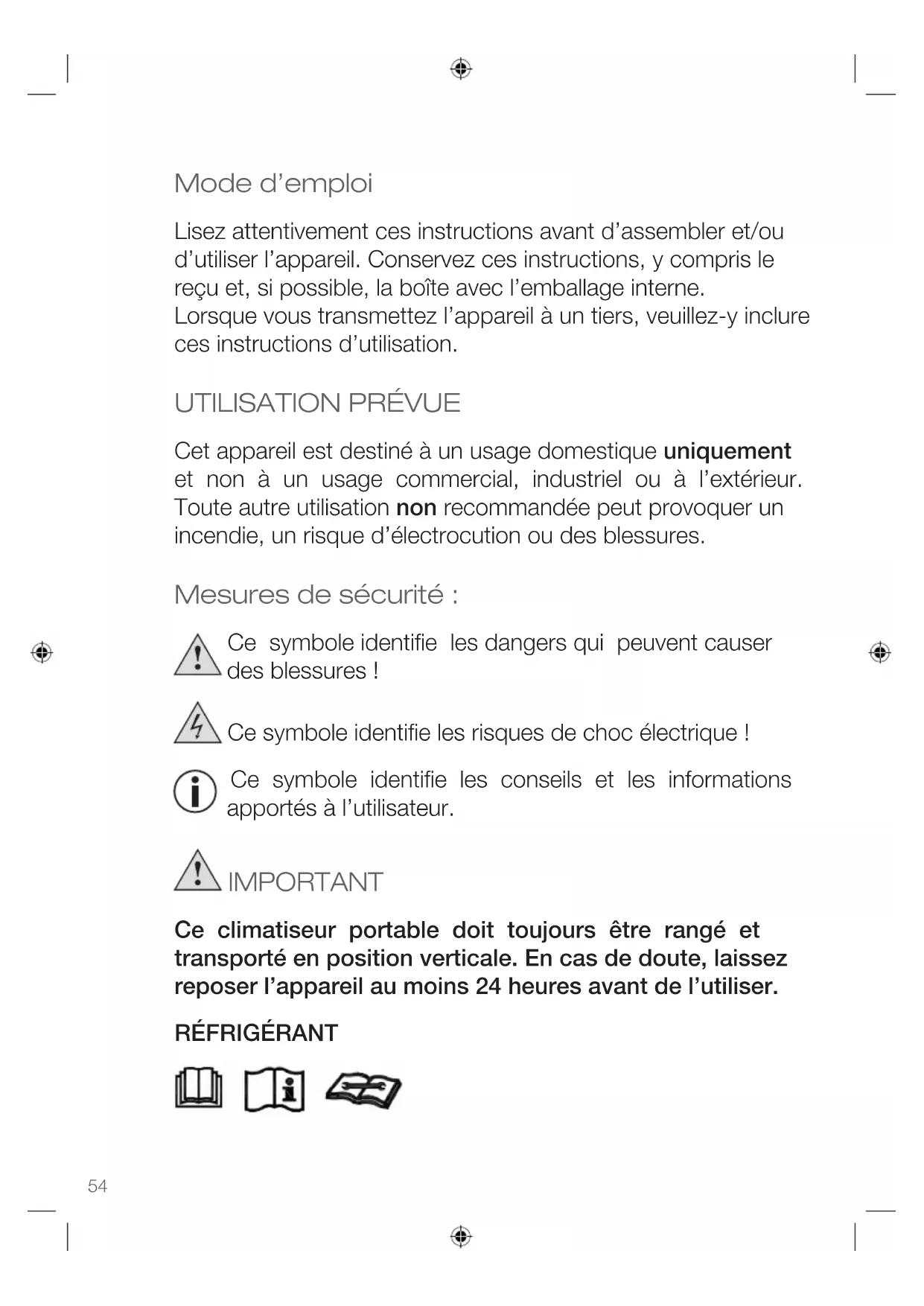 Cet appareil est destiné à un usage domestique uniquement et non à un usage commercial, industriel ou à l’extérieur. Toute autre utilisation non recommandée peut provoquer un incendie, un risque d’électrocution ou des blessures. Mesures de sécurité : Ce symbole identifie les dangers qui peuvent causer des blessures ! Ce symbole identifie les risques de choc électrique ! Ce symbole identifie les conseils et les informations apportés à l’utilisateur. IMPORTANT Ce climatiseur portable doit toujours être rangé et transporté en position verticale. En cas de doute, laissez reposer l’appareil au moins 24 heures avant de l’utiliser. RÉFRIGÉRANTFRANçAIS Manuel d‘instructions