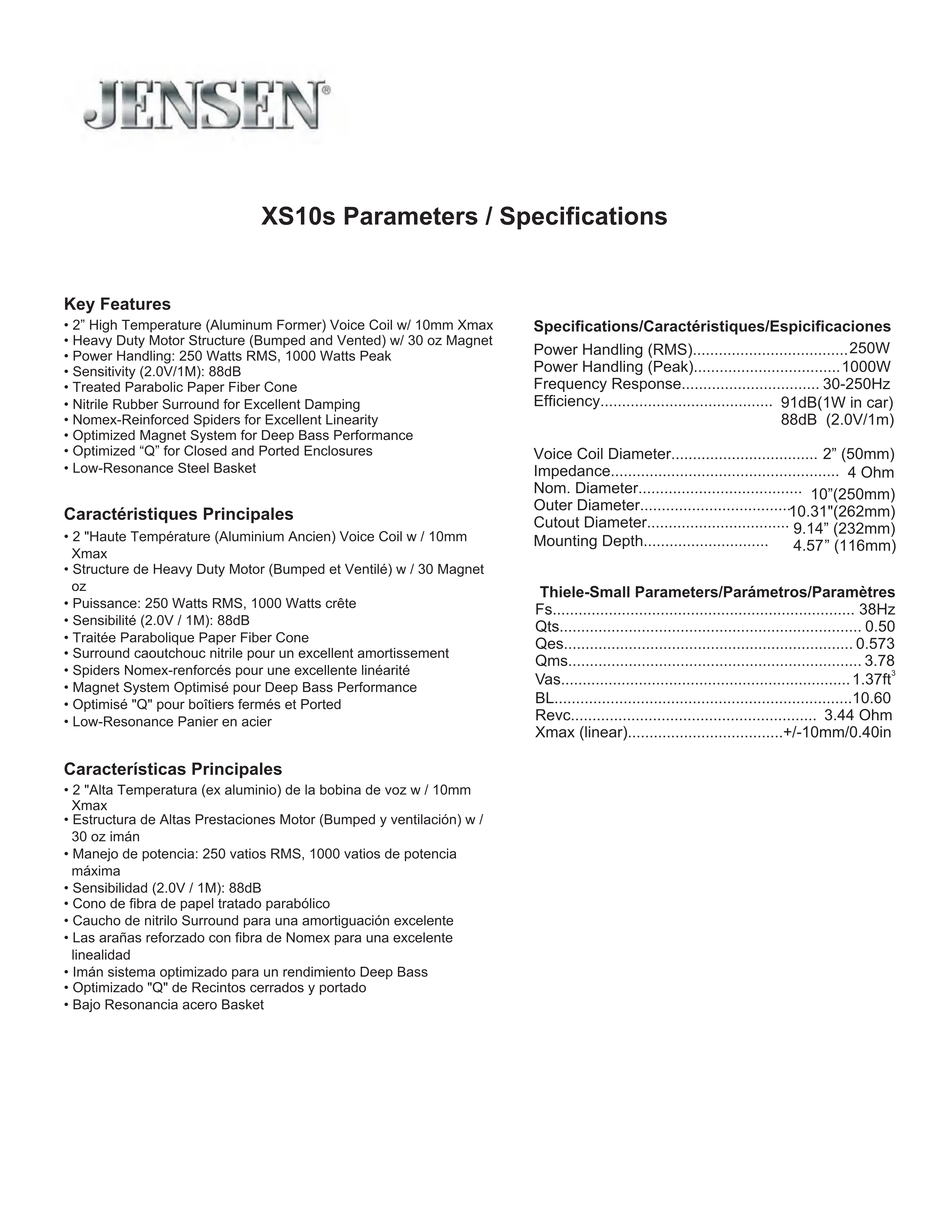 - Puissance: 250 Watts RMS, 1000 Watts crête• Sensibilité (2.0V / 1M): 88dB• Traitée Parabolique Paper Fiber Cone• Surround caoutchouc nitrile pour un excellent amortissement• Spiders Nomex-renforcés pour une excellente linéarité• Magnet System Optimisé pour Deep Bass Performance• Optimisé "Q" pour boîtiers fermés et Ported• Low-Resonance Panier en acier1.0ft
