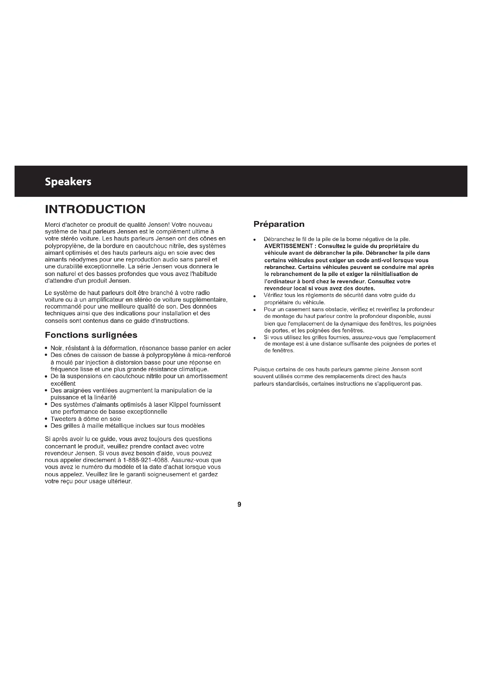 SpeakersINTRODUCTION Merci d'acheter ce produit de qualité Jensen! Votre nouveau système de haut parleurs Jensen est le complément ultime à votre stéréo voiture. Les hauts parleurs Jensen ont des cônes en polypropylène, de la bordure en caoutchouc nitrile, des systèmes aimant optimisés et des hauts parleurs aigu en soie avec des aimants néodymes pour une reproduction audio sans pareil et une durabilité exceptionnelle. La série Jensen vous donnera le son naturel et des basses profondes que vous avez l'habitude d'attendre d'un produit Jensen. Le système de haut parleurs doit être branché à votre radio voiture ou à un amplificateur en stéréo de voiture supplémentaire, recommandé pour une meilleure qualité de son. Des données techniques ainsi que des indications pour installation et des conseils sont contenus dans ce guide d'instructions. Fonctions surlignées