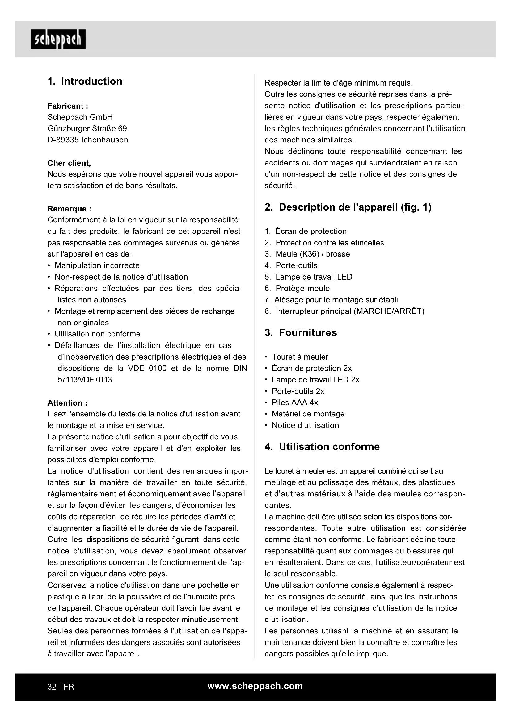 Fabricant : Scheppach GmbH Günzburger Straße 69 D-89335 Ichenhausen Cher client, Nous espérons que votre nouvel appareil vous appor- tera satisfaction et de bons résultats. Remarque : Conformément à la loi en vigueur sur la responsabilité du fait des produits, le fabricant de cet appareil n'est pas responsable des dommages survenus ou générés sur l'appareil en cas de :