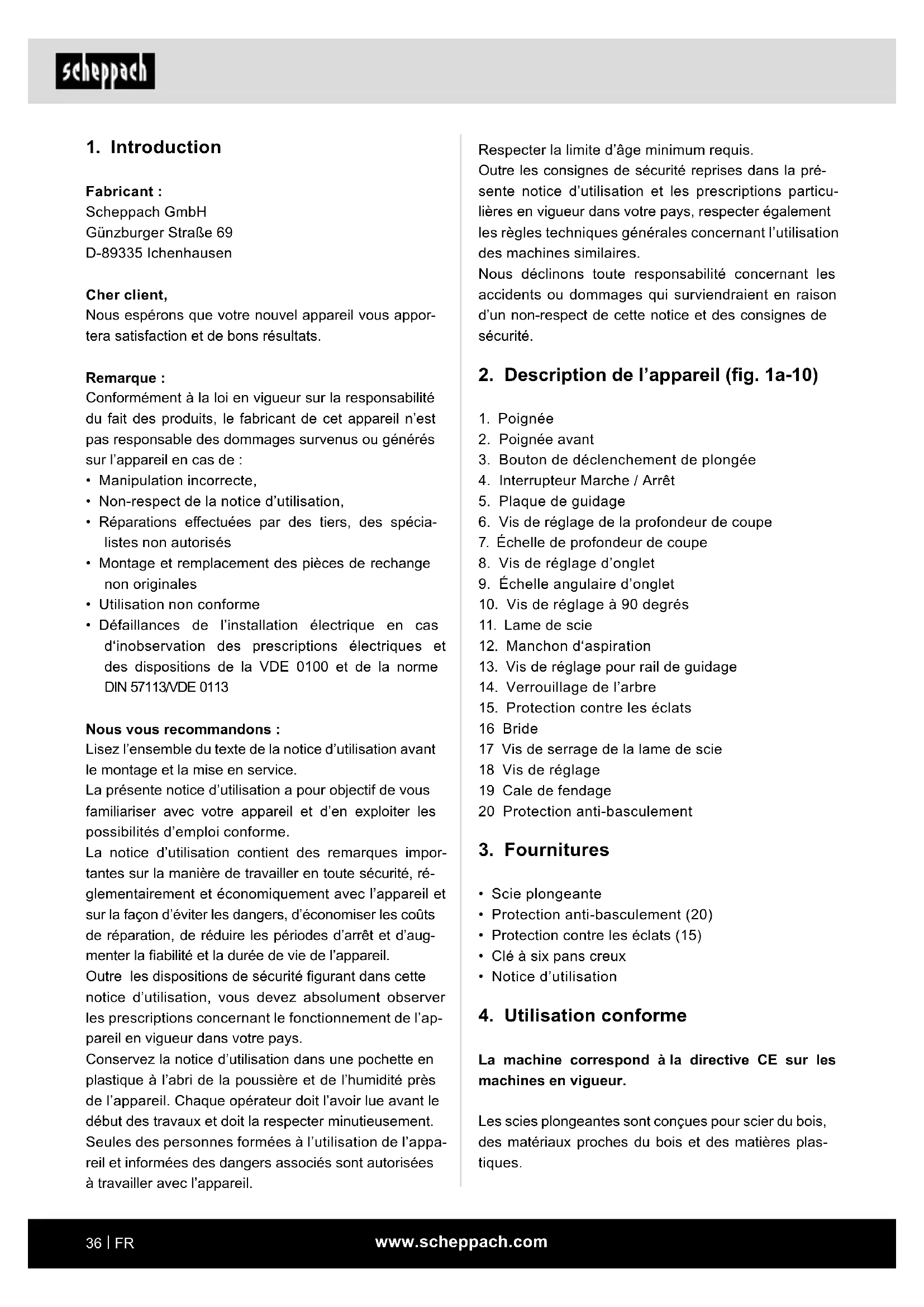 - Utilisation ou maintenance de la scie plongeante par des personnes qui ne se sont pas familiarisées avec la scie plongeante et/ou qui ne comprennent pas les dangers qui y sont liés. Une utilisation conforme consiste à respecter les consignes de sécurité, ainsi que les instructions de montage et les consignes d’utilisation du mode d’emploi. Les personnes utilisant la machine et en assurant la maintenance doivent bien la connaître et connaître les dangers possibles qu’elle implique. En outre, les prescriptions de prévention des accidents doivent être respectées de la manière la plus scrupu- leuse possible. Toutes les autres règles de médecine du travail et de sécurité doivent être respectées. Toute modication de la machine annule toute garantie du fabricant pour les dommages en résultant.www.scheppach.com