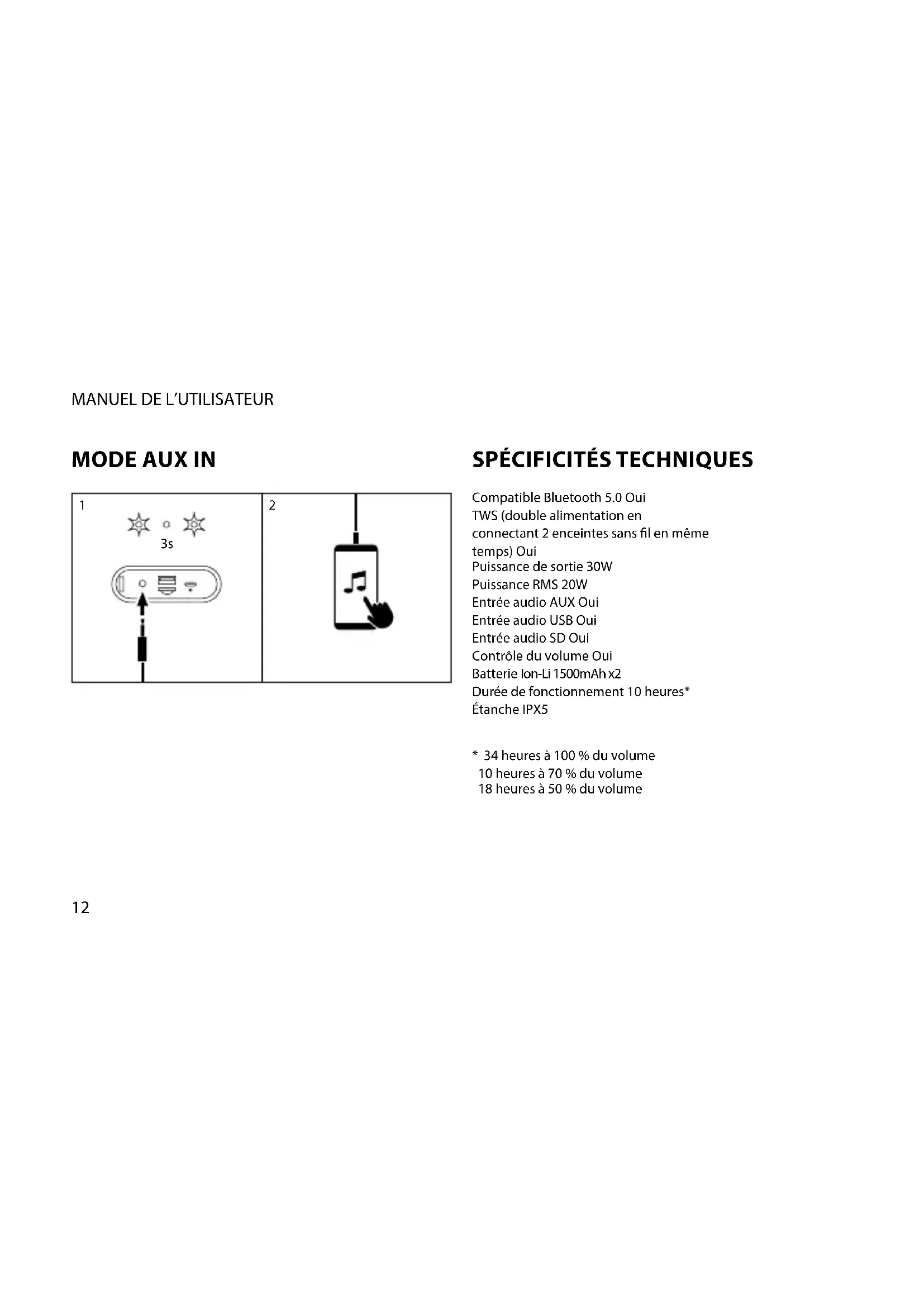 - 34 heures à 100 % du volume 10 heures à 70 % du volume 18 heures à 50 % du volume Compatible Bluetooth 5.0 Oui TWS (double alimentation en connectant 2 enceintes sans l en même temps) Oui Puissance de sortie 30W Puissance RMS 20W Entrée audio AUX Oui Entrée audio USB Oui Entrée audio SD Oui Contrôle du volume Oui Batterie Ion-Li 1500mAh x2 Durée de fonctionnement 10 heures* Étanche IPX5