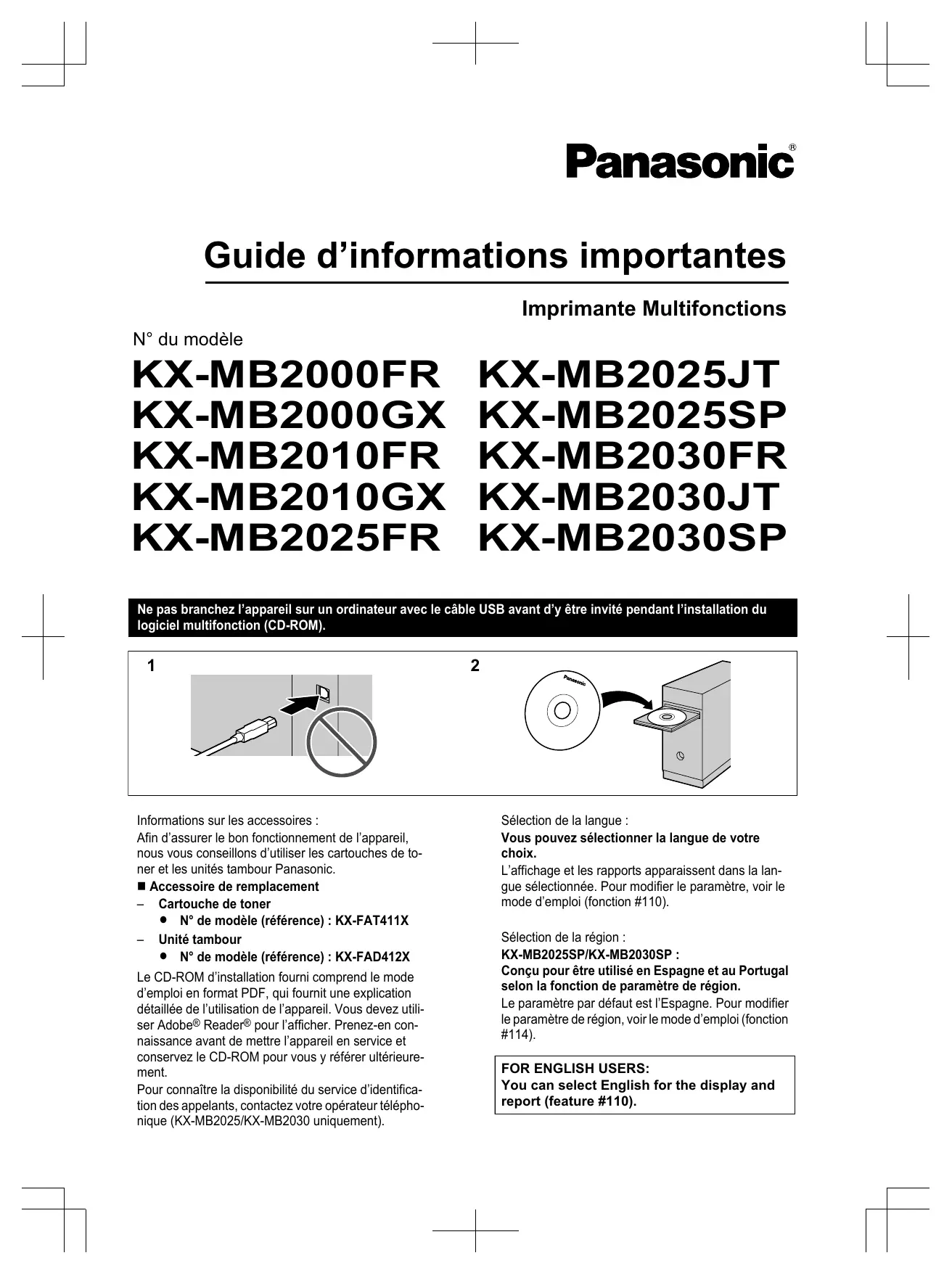 Guide d’informations importantes Imprimante Multifonctions N° du modèle KX-MB2000FR KX-MB2000GX KX-MB2010FR KX-MB2010GX KX-MB2025FR KX-MB2025JT KX-MB2025SP KX-MB2030FR KX-MB2030JT KX-MB2030SP Ne pas branchez l’appareil sur un ordinateur avec le câble USB avant d’y être invité pendant l’installation du logiciel multifonction (CD-ROM).