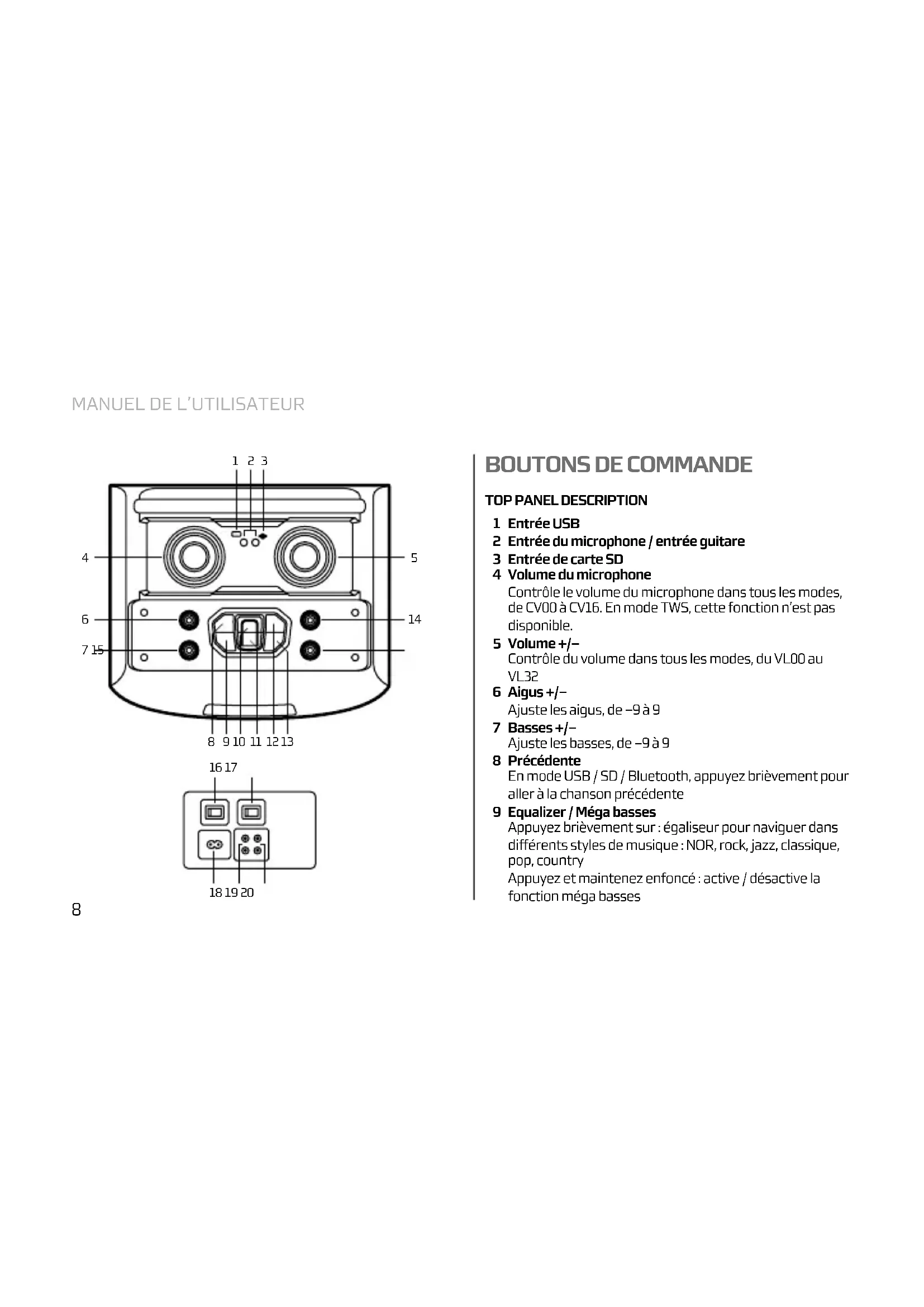 Entrée USB Entrée du microphone / entrée guitare Entrée de carte SD Volume du microphone Contrôle le volume du microphone dans tous les modes, de CV00 à CV16. En mode TWS, cette fonction n’est pas disponible. Volume +/– Contrôle du volume dans tous les modes, du VL00 au VL32 Aigus +/– Ajuste les aigus, de –9 à 9 Basses +/– Ajuste les basses, de –9 à 9 Précédente En mode USB / SD / Bluetooth, appuyez brièvement pour aller à la chanson précédente Equalizer / Méga basses Appuyez brièvement sur : égaliseur pour naviguer dans différents styles de musique : NOR, rock, jazz, classique, pop, country Appuyez et maintenez enfoncé : active / désactive la fonction méga basses