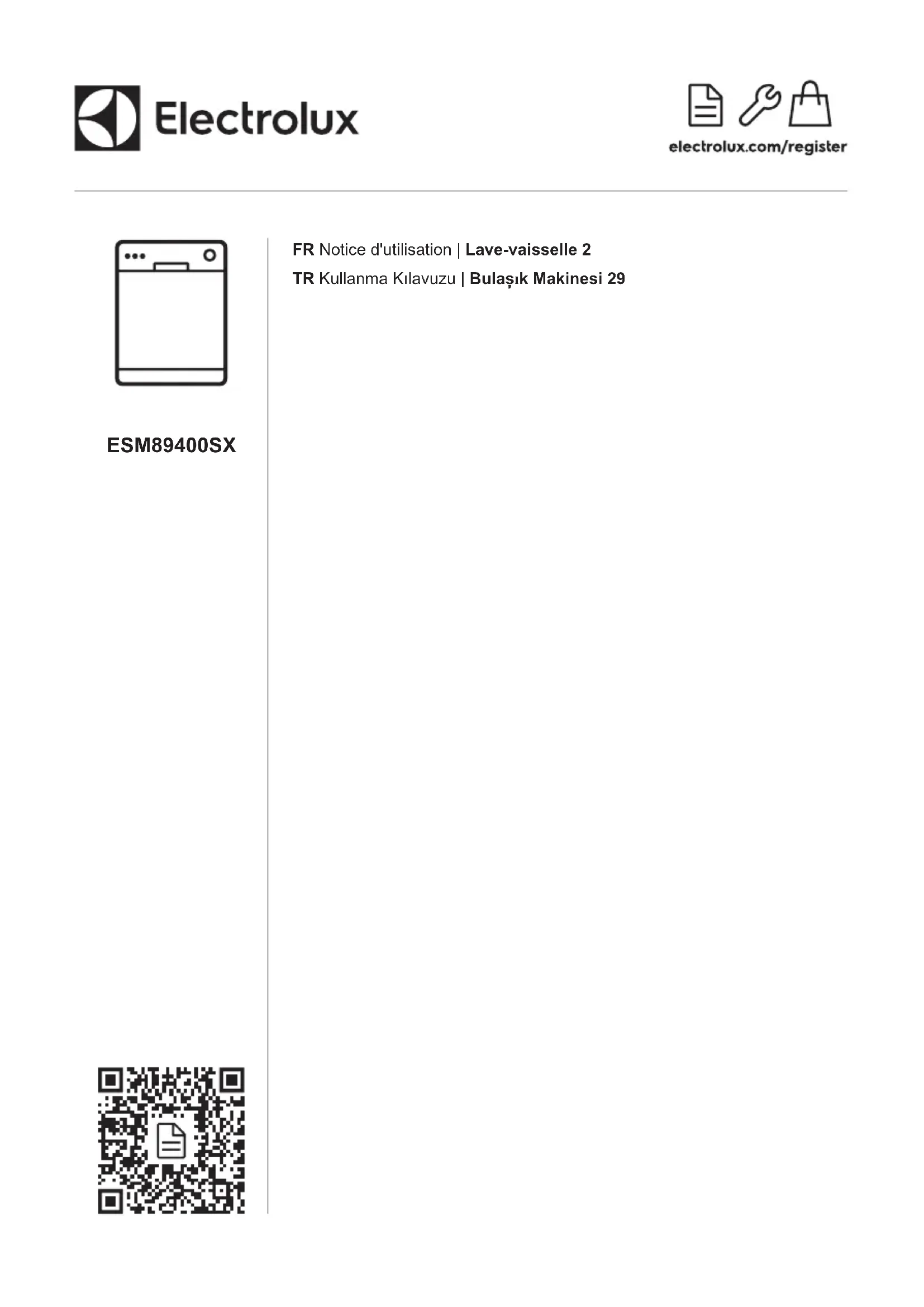 ESM89400SX FR Notice d'utilisation | Lave-vaisselle 2 TR Kullanma Kılavuzu | Bulaşık Makinesi 29NOUS PENSONS À VOUS Merci d’avoir choisi un appareil Electrolux. Vous avez choisi un produit qui bénéficie de décennies d'expérience professionnelle et d'innovation. Ingénieux et élégant, il a été pensé pour vous. C'est la raison pour laquelle vous pouvez avoir la certitude d'obtenir d'excellents résultats à chaque utilisation. Bienvenue chez Electrolux Consultez notre site pour : Obtenir des conseils d’utilisation, des brochures, un dépanneur, des informations surle service et les réparations :www.electrolux.com/supportEnregistrer votre produit pour un meilleur service :www.registerelectrolux.comAcheter des accessoires, consommables et pièces de rechange d’origine pour votreappareil :www.electrolux.com/shop