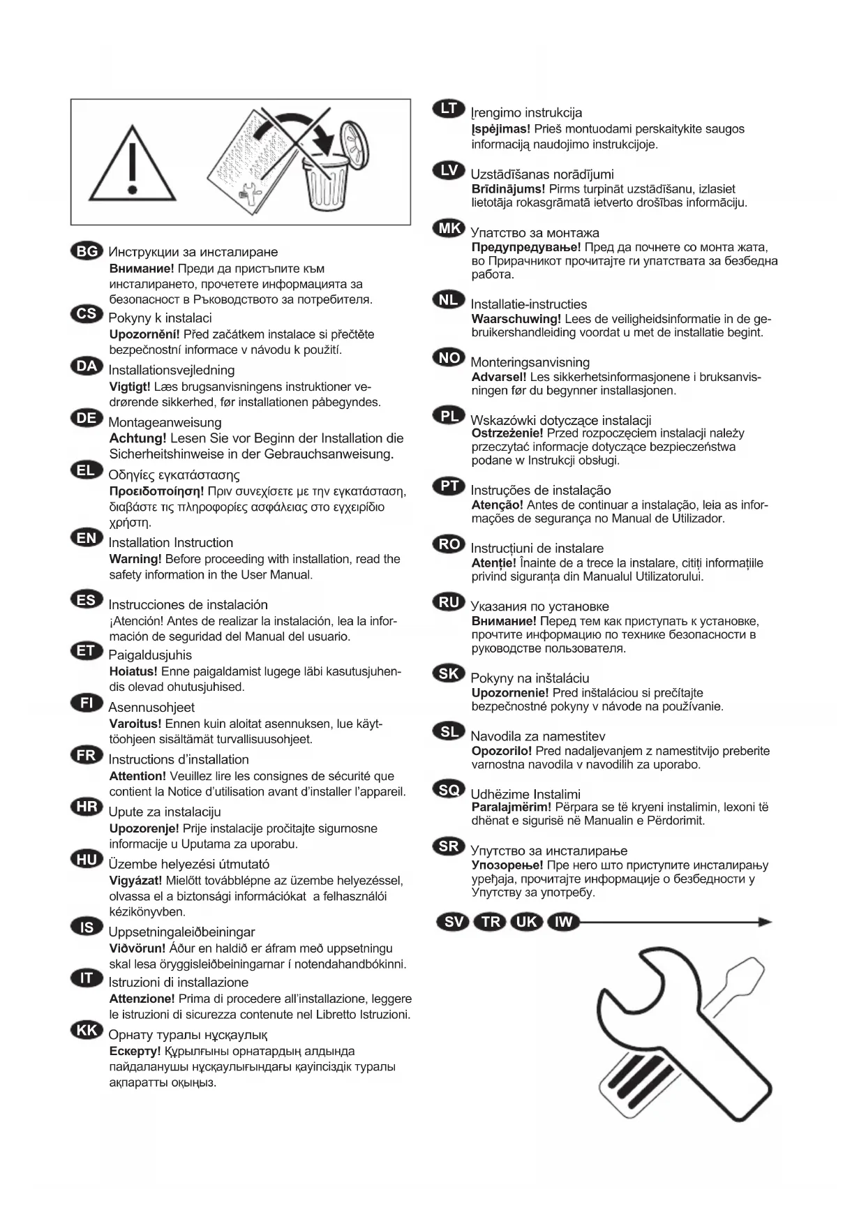 Instructions d’installation Attention! Veuillez lire les consignes de sécurité que contient la Notice d’utilisation avant d’installer l’appareil.
