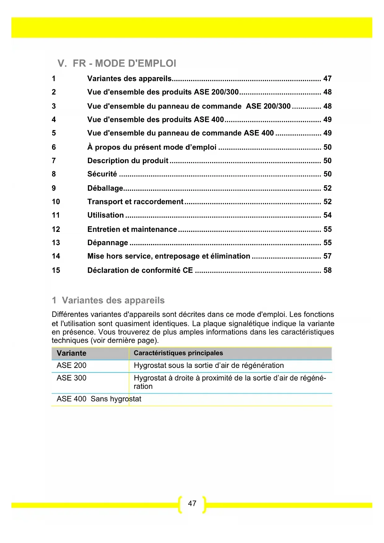 - 15 Déclaration de conformité CE 1 Variantes des appareils Différentes variantes d'appareils sont décrites dans ce mode d'emploi. Les fonctions et l'utilisation sont quasiment identiques. La plaque signalétique indique la variante en présence. Vous trouverez de plus amples informations dans les caractéristiques techniques (voir dernière page). Variante Caractéristiques principales ASE 200 Hygrostat sous la sortie d’air de régénération ASE 300 Hygrostat à droite à proximité de la sortie d’air de régéné- ration ASE 400 Sans hygrostat48 2 Vue d'ensemble des produits ASE 200/300 Fig. 1 : ASE 300 (similaire au modèle ASE 200) 1 Sortie d’air de régénération 6 Compteur de kWh pour le calcul de la consommation d’électricité 2 Compteur d’heure de fonc- tionnement 7 Entrée d’air de processus avec filtre à air 3 Poignée de transport 8 Plaque de raccordement avec sortie d’air sec 4 Hygrostat 9 Prise secteur p. 58