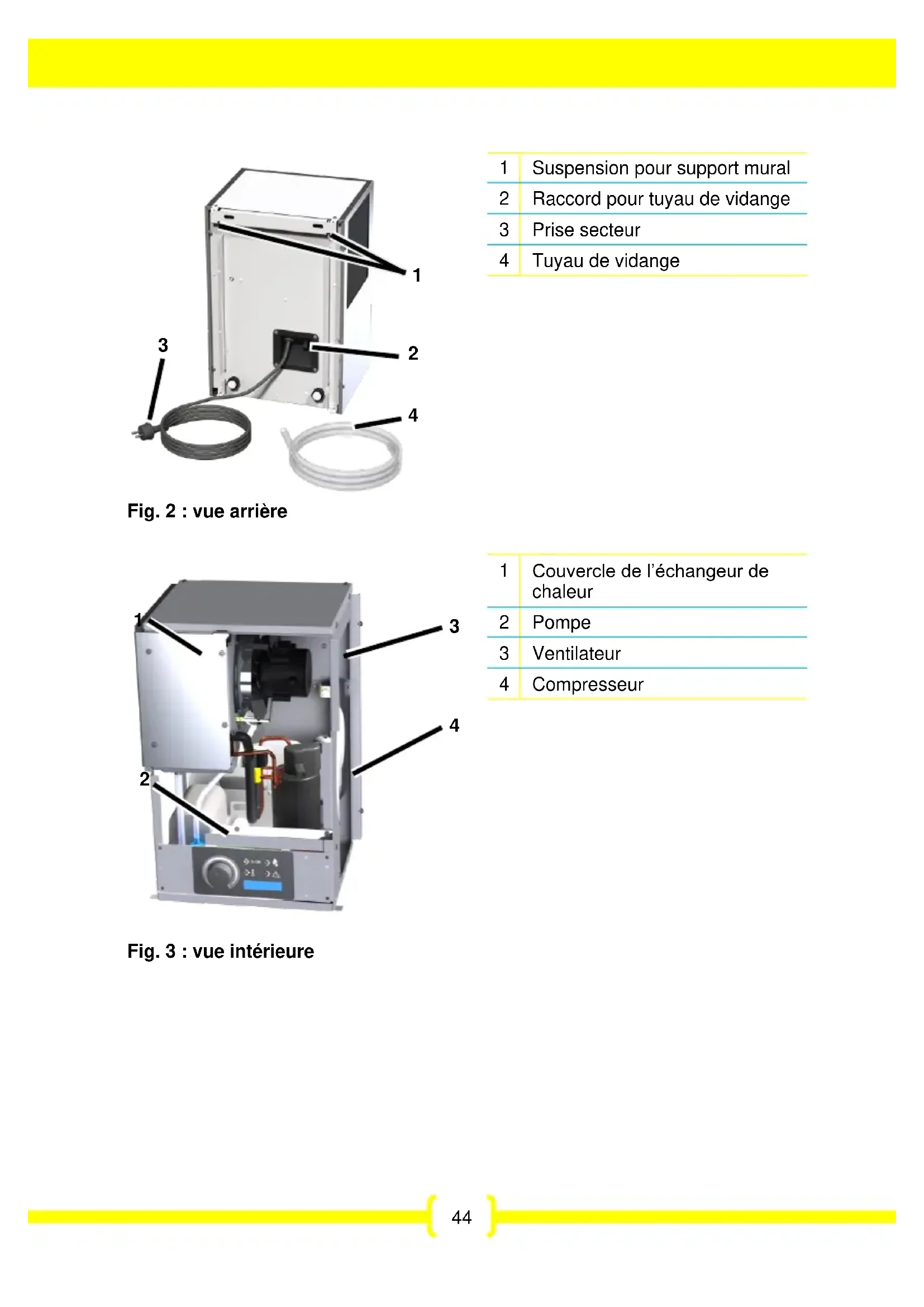 4 À propos du présent mode d’emploi Le présent mode d’emploi ne peut être reproduit, dupliqué ou distribué sans l’accord écrit du fabricant. Important : lire attentivement avant l’utilisation. Conserver pour une référence future. 5 Description du produit Le déshumidificateur régule l'humidité dans la pièce. L’eau de condensation qui en résulte est pompée par un tuyau de vidange. Le déshumidificateur est équipé d'un système de dégivrage automatique. Le déshumidificateur est conçu pour un montage mural.