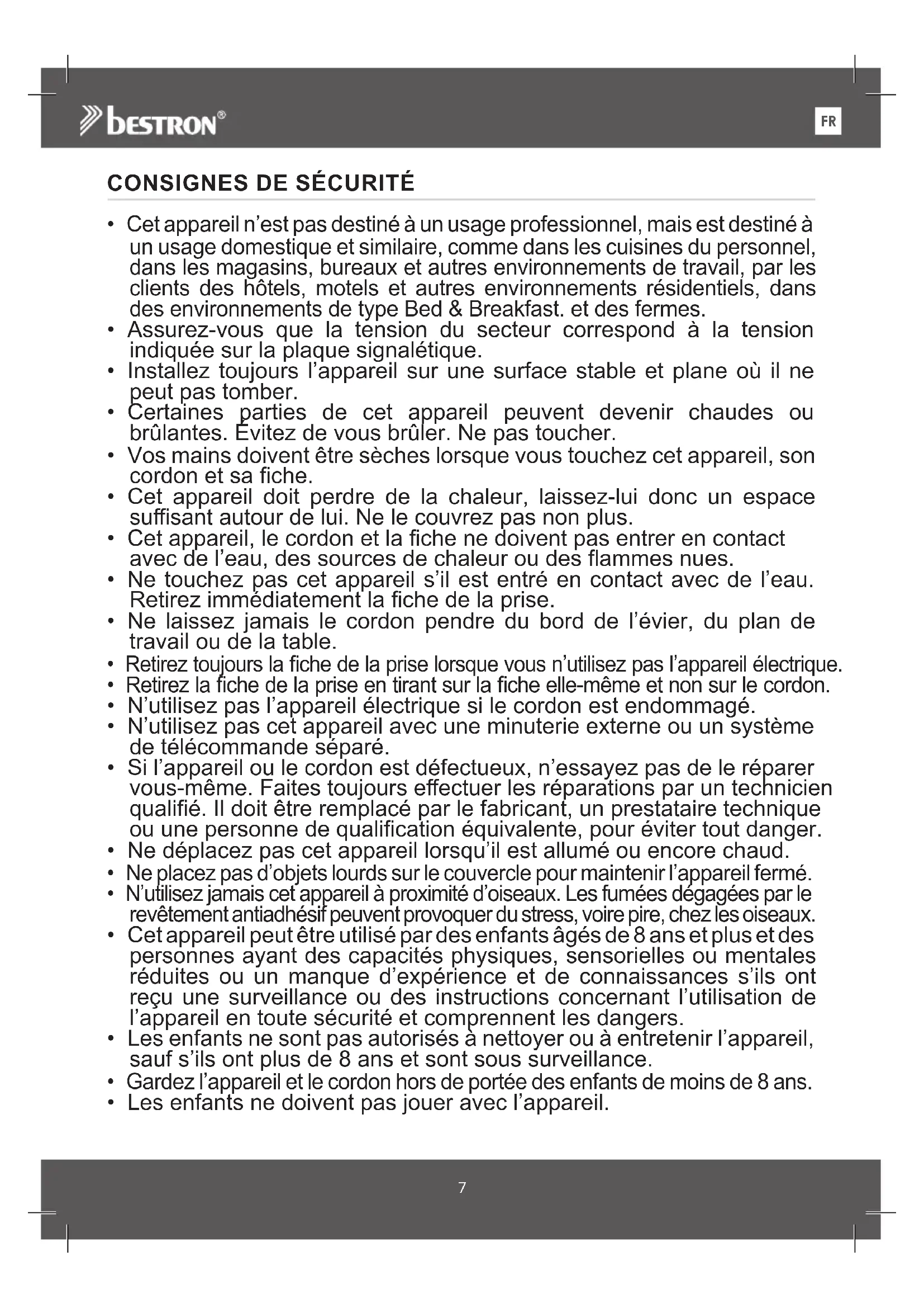 - Informez-vous auprès de votre commune pour obtenir la liste des points de collecte à proximité de chez vous. SERVICE Dans le cas peu probable d’un dysfonctionnement, veuillez contacter le service client de Bestron : www.bestron.com/service Spécications techniques Modèle ASW401 Tension 220-240V~ Fréquence (Hz) 50/60 Classe de protection 1 Puissance (Watt) 700 Bruit (dB(A)) - Max. Capacité - Opération de courte durée (KB) - Dimensions de l'appareil (L x H x P) (cm) 24x23x9,4 Longueur du cordon (cm) 70