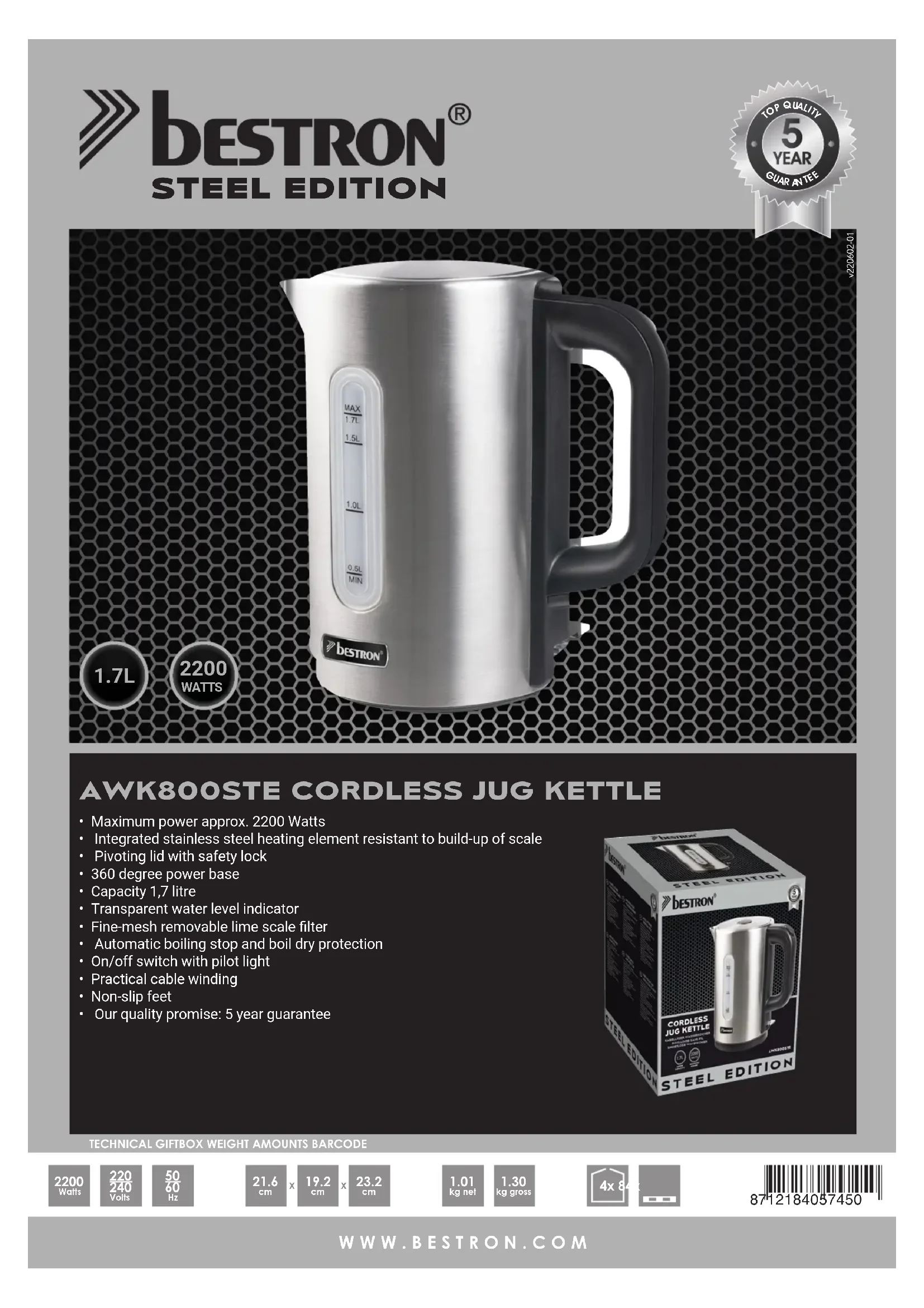 | Caractéristiques techniques | Capacité : 1,7 L, Puissance : 2200 W, Matériau : Acier inoxydable |
