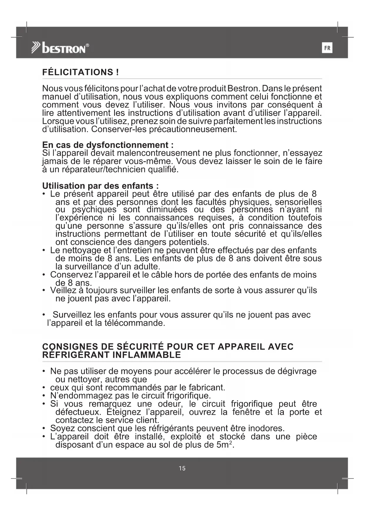 FÉLICITATIONS ! Nous vous félicitons pour l’achat de votre produit Bestron. Dans le présent manuel d’utilisation, nous vous expliquons comment celui fonctionne et comment vous devez l’utiliser. Nous vous invitons par conséquent à lire attentivement les instructions d’utilisation avant d’utiliser l’appareil. Lorsque vous l’utilisez, prenez soin de suivre parfaitement les instructions d’utilisation. Conserver-les précautionneusement. En cas de dysfonctionnement : Si l’appareil devait malencontreusement ne plus fonctionner, n’essayez jamais de le réparer vous-même. Vous devez laisser le soin de le faire à un réparateur/technicien qualifié. Utilisation par des enfants :