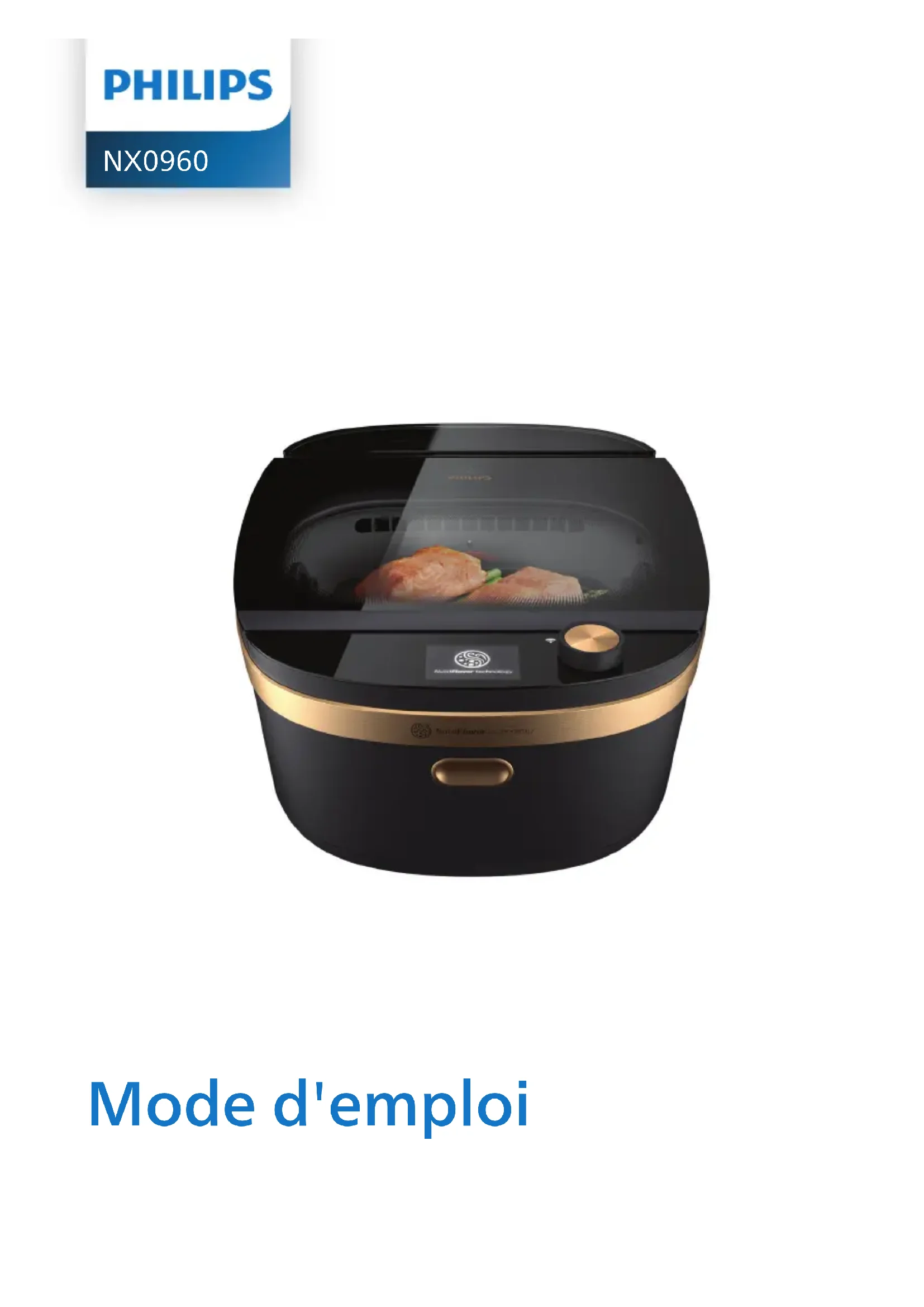 - N'utilisez pas d'acides acétiques pour le détartrage.6 Français Champs électromagnétiques (CEM) Cet appareil Philips est conforme à toutes les normes et à tous les règlements applicables relatifs à l'exposition aux champs électromagnétiques. Arrêt automatique L'Air Cooker est équipé d'une fonction d'arrêt automatique. Lorsque l'appareil est allumé mais qu'il n'est pas en mode de cuisson ou de maintien au chaud, il passe en mode veille au bout de 20 minutes sans action de la part de l'utilisateur ou utilisatrice. Pour éteindre l'appareil manuellement, appuyez longuement sur le sélecteur. Introduction Félicitations pour votre achat et bienvenue chez Philips ! Pour proter pleinement de l'assistance oerte par Philips, enregistrez votre produit à l'adresse suivante : www.philips.com/welcome. L'Air Cooker Philips utilise la technologie NutriFlavor pour créer une combinaison optimale de circulation d'air chaud et d'humidité an de cuire tous les aliments à la perfection. Des légumes croquants, du poisson fondant, de la viande tendre, des gâteaux moelleux, tout en préservant jusqu'à 90 % des nutriments*. Découvrez le plaisir de préparer de délicieux plats sains d'une simple pression sur un bouton. Pour obtenir plus d'informations sur l'Air Cooker ainsi que des idées et des recettes, visitez le site www.philips.com/welcome ou téléchargez l'application gratuite NutriU** pour IOS® ou Android™. *Testé sur le brocoli, le poivron et les pois mange-tout (90 % de la vitamine C), sur le saumon (93 % des omégas 3/6), et sur le bœuf (90 % du fer). Mesures réalisées en laboratoire avec le réglage Air Steam. ** Il est possible que l'application NutriU ne soit pas disponible dans votre pays. Dans ce cas, visitez votre site Web Philips local pour y trouver des idées.7Français Vue générale