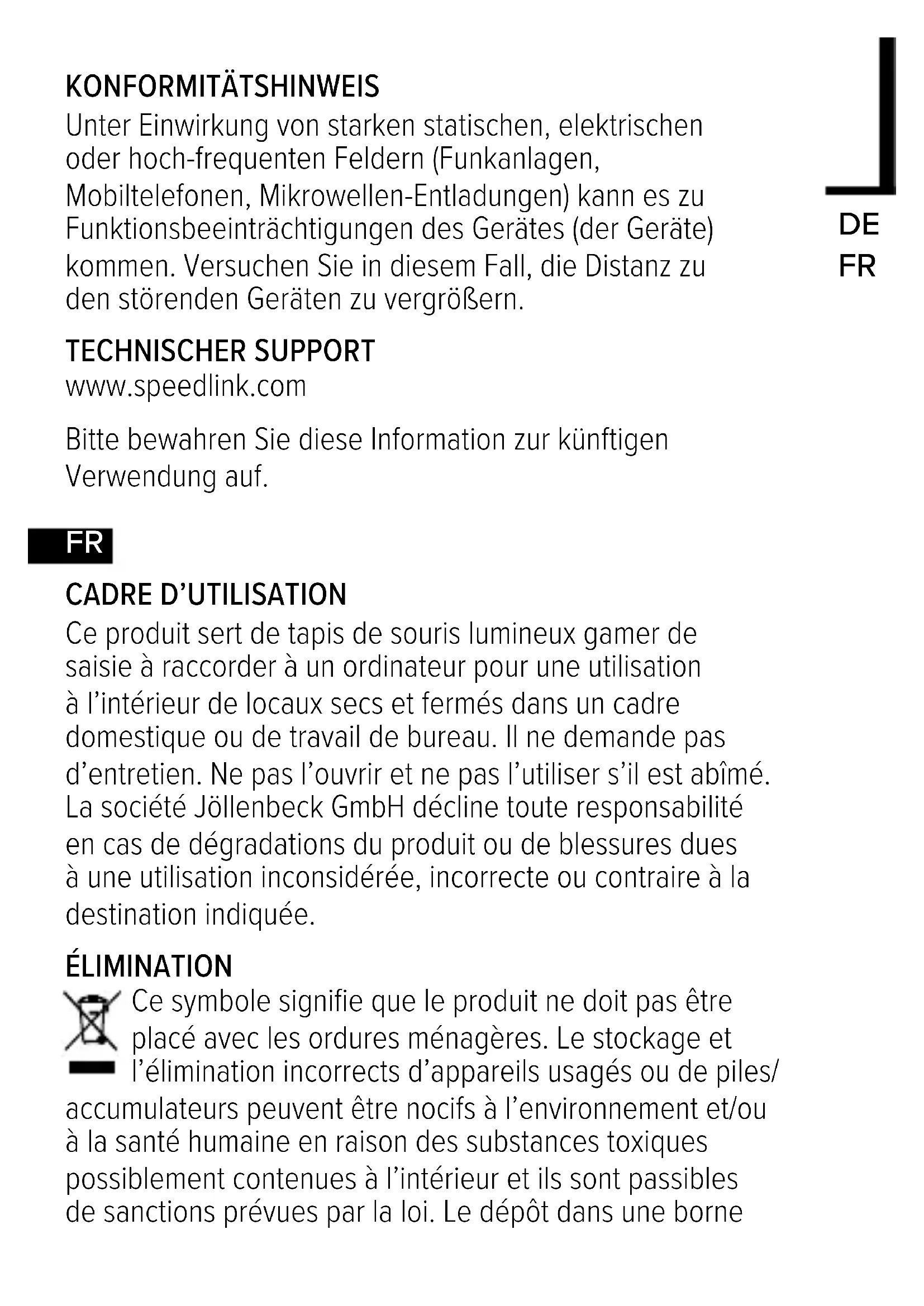 La présence de champs statiques, électriques ou à haute fréquence intenses (installations radio, téléphones mobiles, décharges de micro-ondes) peut perturber le bon fonctionnement de l’appareil (ou des appareils). Dans ce cas, essayez d’éloigner les appareils à l’origine des perturbations. ASSISTANCE TECHNIQUE www.speedlink.com Veuillez conserver ces informations afin de pouvoir vous y référer ultérieurement.
