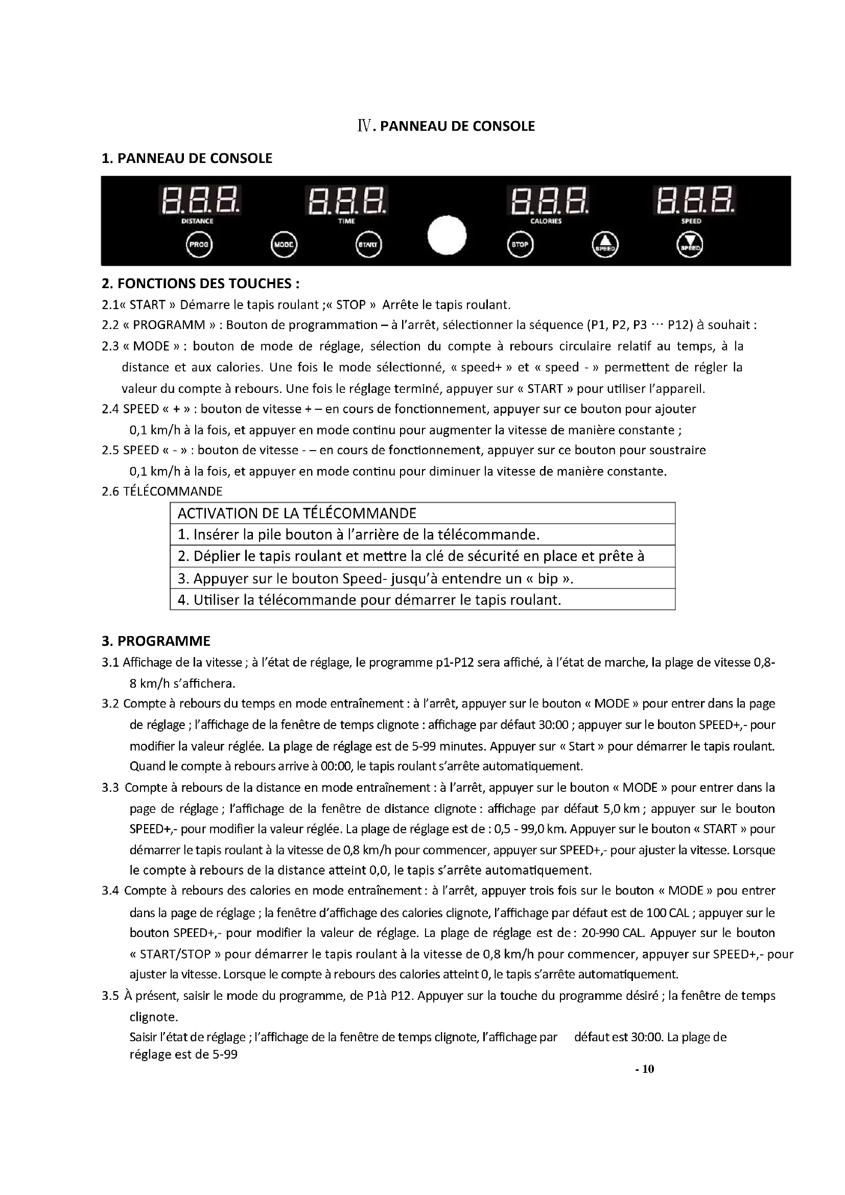 PROGRAMME 3.1 Affichage de la vitesse ; à l’état de réglage, le programme p1-P12 sera affiché, à l’état de marche, la plage de vitesse 0,8- 8 km/h s’affichera.