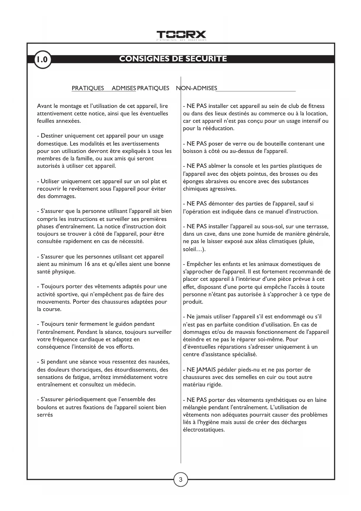 PROGRAMME WATT ............................................................................................................................................... pag. 25 3.10 BODY FAT TEST (TEST DE GRAISSE CORPORELLE).............................................................................................pag. 253 - NE PAS installer cet appareil au sein de club de fitness ou dans des lieux destinés au commerce ou à la location, car cet appareil n’est pas conçu pour un usage intensif ou pour la rééducation. - NE PAS poser de verre ou de bouteille contenant une boisson à côté ou au-dessus de l'appareil. - NE PAS abîmer la console et les parties plastiques de l'appareil avec des objets pointus, des brosses ou des éponges abrasives ou encore avec des substances chimiques agressives. - NE PAS démonter des parties de l'appareil, sauf si l’opération est indiquée dans ce manuel d'instruction. - NE PAS installer l'appareil au sous-sol, sur une terrasse, dans un cave, dans une zone humide de manière générale, ne pas le laisser exposé aux aléas climatiques (pluie, soleil…). - Empêcher les enfants et les animaux domestiques de s'approcher de l'appareil. Il est fortement recommandé de placer cet appareil à l’intérieur d’une pièce prévue à cet effet, disposant d’une porte qui empêche l’accès à toute personne n’étant pas autorisée à s’approcher à ce type de produit. - Ne jamais utiliser l'appareil s’il est endommagé ou s’il n’est pas en parfaite condition d’utilisation. En cas de dommages et/ou de mauvais fonctionnement de l'appareil éteindre et ne pas le réparer soi-même. Pour d’éventuelles réparations s'adresser uniquement à un centre d'assistance spécialisé. - NE JAMAIS pédaler pieds-nu et ne pas porter de chaussures avec des semelles en cuir ou tout autre matériau rigide. - NE PAS porter des vêtements synthétiques ou en laine mélangée pendant l'entraînement. L’utilisation de vêtements non adéquates pourrait causer des problèmes liés à l'hygiène mais aussi de créer des décharges électrostatiques.