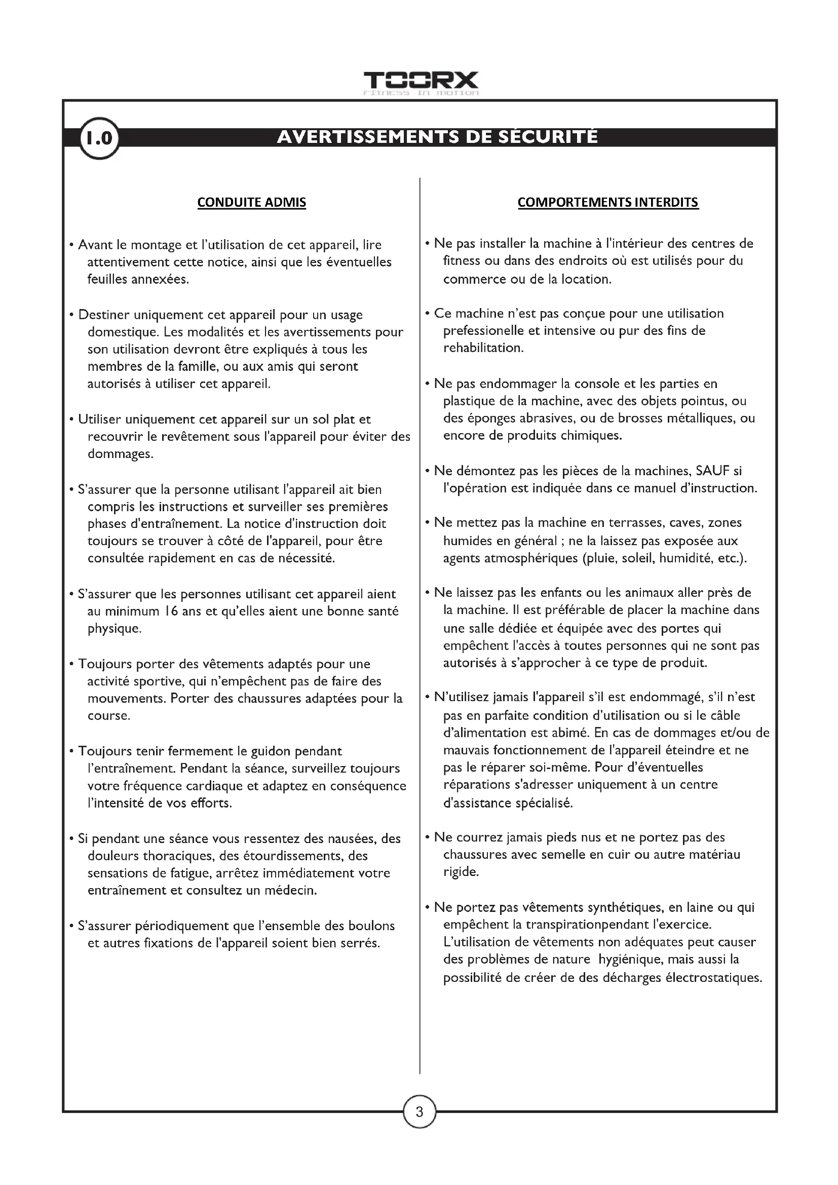 Il est indispensable de suivre toutes les instructions et les avertissements contenus dans cette notice, pour être sûr de vous entraîner en sécurité. Des efforts intensifs et prolongés requirent une bonne condition physique ; c'est pour cela qu'il convient d'évaluer les contreindications d'utilisation, listées ci-après.