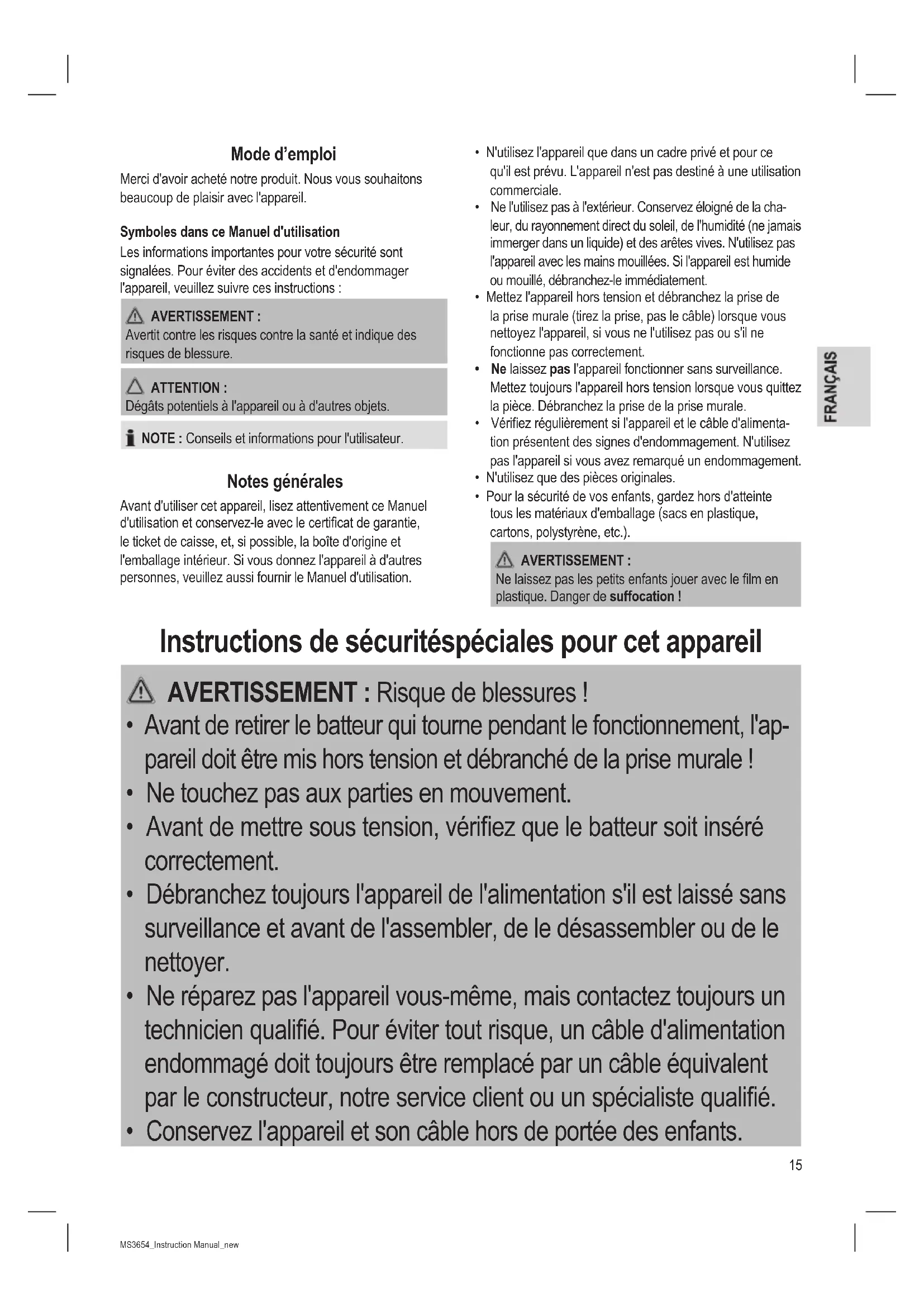 - Conservez l'appareil et son câble hors de portée des enfants.16 MS3654_Instruction Manual_new 01.07.16