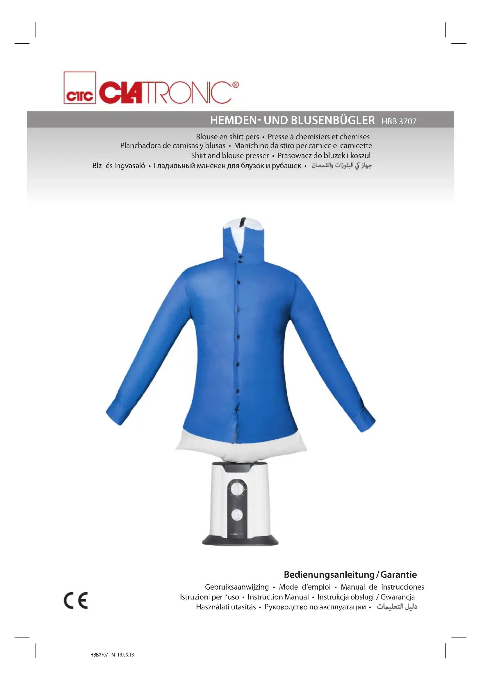 - N’utilisez jamais de produits corrosifs ou abrasifs. Boîtier Pour nettoyer l’extérieur de l’appareil, un torchon normale- ment humide suft. Corps du ballon Vous pouvez essuyer le corps de ballon avec un tissu humide. Accessoires Les accessoires peuvent être nettoyés en les rinçant avec de l’eau chaude. Laissez bien les accessoires sécher avant de remonter l’appareil. Dépannage Problème Cause possible Solution L’appareil ne fonctionne pas. L’appareil ne reçoit pas d’alimentation électrique. Essayez la prise avec un autre appareil. Branchez correc- tement la che secteur. Vériez le disjonc- teur principal. L’appareil est défectueux. Contactez notre centre de service ou un spécialiste. Le vêtement prend trop longtemps pour sécher. Le vêtement est très épais. Répétez la procé- dure. Le vêtement n’était pas sufsamment sec. Laissez-le sécher d’abord. Les fermetures Éclair ne sont pas complètement fermées. Fermez les ferme- tures Éclair. Problème Cause possible Solution L’appareil s’arrête pendant utilisation. Les ouvertures d’entrée ou de sor- tie sont couvertes. Assurez-vous que les ouvertures d’entrée ou de sortie ne soient pas obstruées. La minuterie est éteinte. Réglez à nouveau la minuterie. Votre appareil est muni d’un interrupteur de sécurité. Il bloquera le moteur en cas de surcharge. Débranchez la che électrique de la prise. Laissez refroidir l’appareil avant de le redémarrer. Données techniques Modèle : ................................................................. HBB 3707 Alimentation : .....................................220 - 240 V~, 50 / 60 Hz Consommation : ............................................................ 850 W Classe de protection : .......................................................... Poids net : ..............................................................env. 1,5 kg Nous nous réservons le droit d’apporter des modications techniques ainsi que des modications de conception dans le cadre du développement continu de nos produits. Cet appareil a été contrôlé d’après toutes les directives européennes actuelles applicables, comme par exemple concernant la compatibilité électromagnétique et la basse tension. Cet appareil a été fabriqué en respect des régle- mentations techniques de sécurité les plus récentes.HBB3707_IM 16.03.18