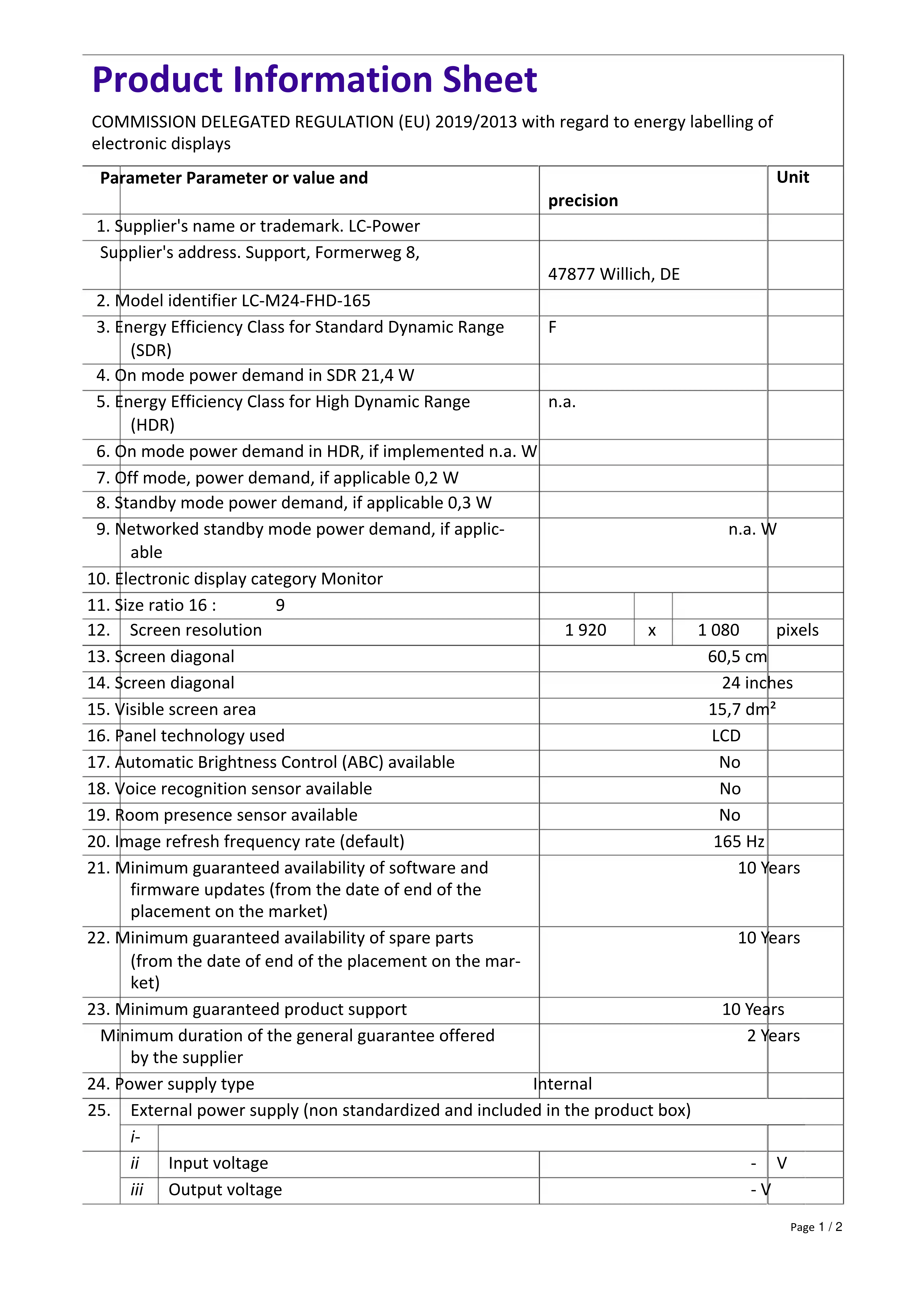 Retrouvez gratuitement la notice de l'appareil M24FHD165 LC-Power au format PDF.