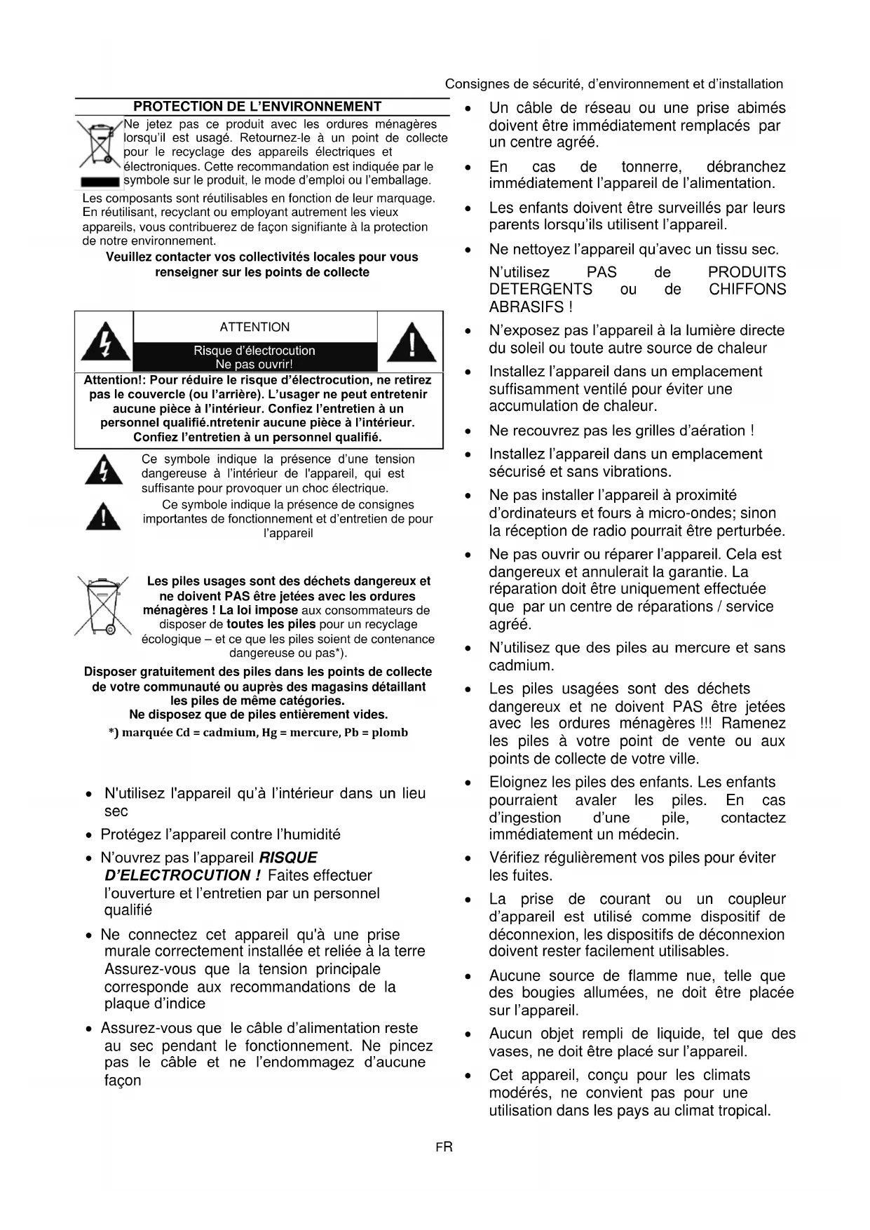 Attention!: Pour réduire le risque d'électrocution, ne retirez pas le couvercle (ou l'arrière). L'usager ne peut entretenir aucune piece à l'intérieur. Confiez l'entretien à un personnel qualifié.
