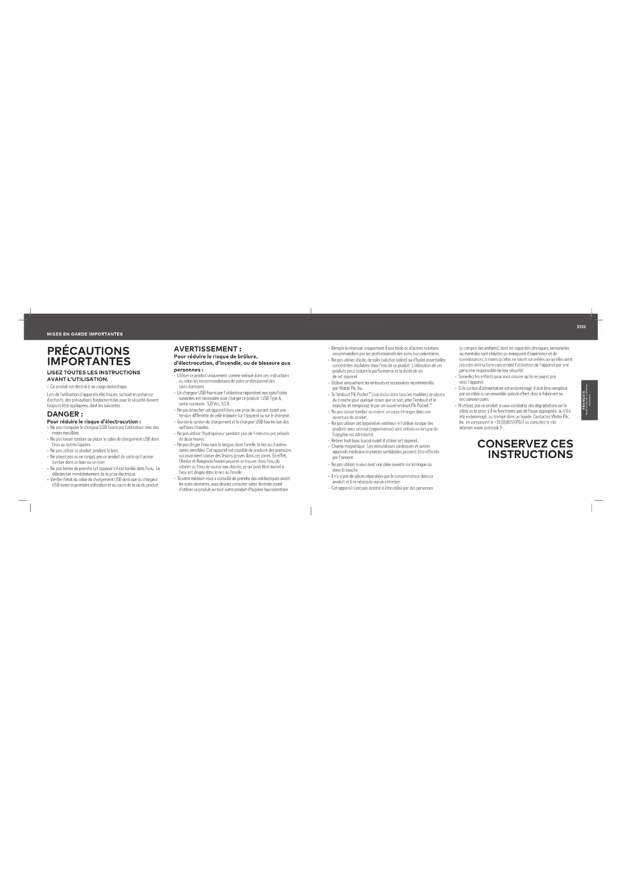 - N’utilisez pas ce produit si vous constatez des dégradations sur le câble ou la prise, s’il ne fonctionne pas de façon appropriée, ou s’il a été endommagé, ou trempé dans un liquide. Contactez Water Pik, Inc. en composant le +33 (0)805101551 ou consultez le site internet www.waterpik.fr. CONSERVEZ CES INSTRUCTIONSFRANÇAIS