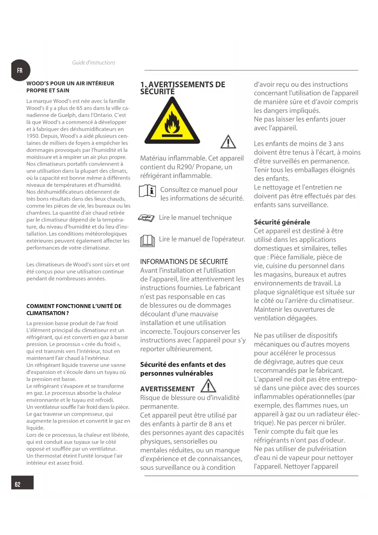 SÉCURITÉ Matériau inammable. Cet appareil contient du R290/ Propane, un réfrigérant inammable. Consultez ce manuel pour les informations de sécurité. Lire le manuel technique Lire le manuel de l’opérateur.