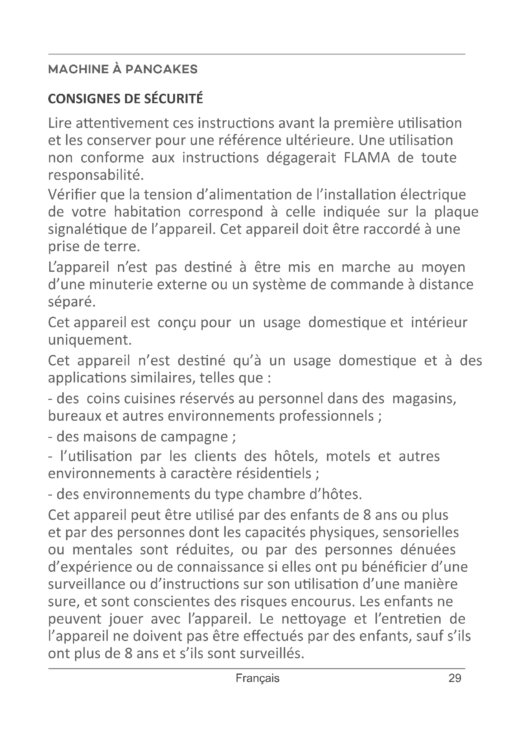 Lire aenvement ces instrucons avant la première ulisaon et les conserver pour une référence ultérieure. Une ulisaon non conforme aux instrucons dégagerait FLAMA de toute responsabilité. Vérier que la tension d’alimentaon de l’installaon électrique de votre habitaon correspond à celle indiquée sur la plaque signaléque de l’appareil. Cet appareil doit être raccordé à une prise de terre. L’appareil n’est pas desné à être mis en marche au moyen d’une minuterie externe ou un système de commande à distance séparé. Cet appareil est conçu pour un usage domesque et intérieur uniquement. Cet appareil n’est desné qu’à un usage domesque et à des applicaons similaires, telles que : - des coins cuisines réservés au personnel dans des magasins, bureaux et autres environnements professionnels ; - des maisons de campagne ; - l’ulisaon par les clients des hôtels, motels et autres environnements à caractère résidenels ; - des environnements du type chambre d’hôtes. Cet appareil peut être ulisé par des enfants de 8 ans ou plus et par des personnes dont les capacités physiques, sensorielles ou mentales sont réduites, ou par des personnes dénuées d’expérience ou de connaissance si elles ont pu bénécier d’une surveillance ou d’instrucons sur son ulisaon d’une manière sure, et sont conscientes des risques encourus. Les enfants ne peuvent jouer avec l’appareil. Le neoyage et l’entreen de l’appareil ne doivent pas être eectués par des enfants, sauf s’ils ont plus de 8 ans et s’ils sont surveillés.30 www.ama.pt Tenir l’appareil et son câble d’alimentaon hors de portée des enfants de moins de 8 ans. Averssement - Les températures des surfaces accessibles peuvent être élevées durant le fonconnement de l’appareil. Débrancher l’appareil de l’alimentaon électrique en rerant la che de la prise de courant après chaque ulisaon et lors du neoyage. Le laisser refroidir avant de le neoyer ou de le ranger. Avant d’allumer l’appareil, veiller à le placer sur une surface plane, stable et horizontale. Ne pas uliser l’appareil si le câble d’alimentaon ou la che sont endommagés, demander immédiatement au service d’assistance technique agréé FLAMA de les remplacer. Si le câble d’alimentaon est endommagé, il doit être remplacé par le fabricant, son service après-vente ou un personnel qualié similaire an d’éviter tout danger. L’appareil ne doit jamais être ulisé à proximité de matériaux inammables ou combusbles. Ne jamais laisser l’appareil sans surveillance. Ne pas couvrir l’appareil lorsqu’il fonconne. Ne pas démonter l’appareil. L’appareil ne doit être ulisé que pour cuisiner les aliments. L’ulisaon à d’autres ns peut causer des dommages irréparables. Ne jamais immerger l’appareil dans de l’eau ou tout autre liquide.