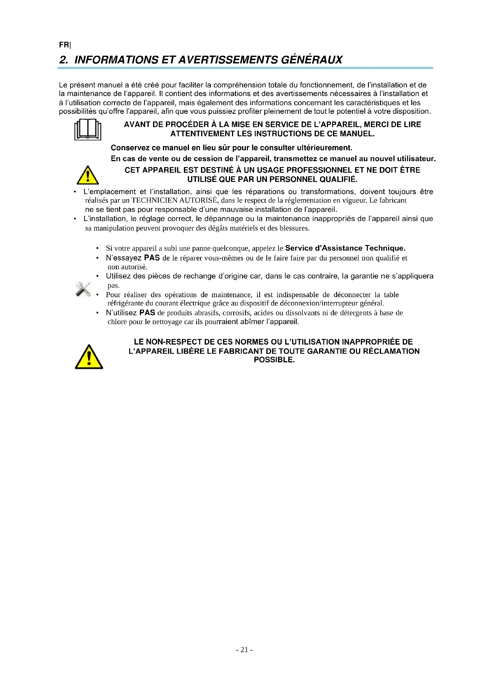 - Pour réaliser des opérations de maintenance, il est indispensable de déconnecter la table réfrigérante du courant électrique grâce au dispositif de déconnexion/interrupteur général.