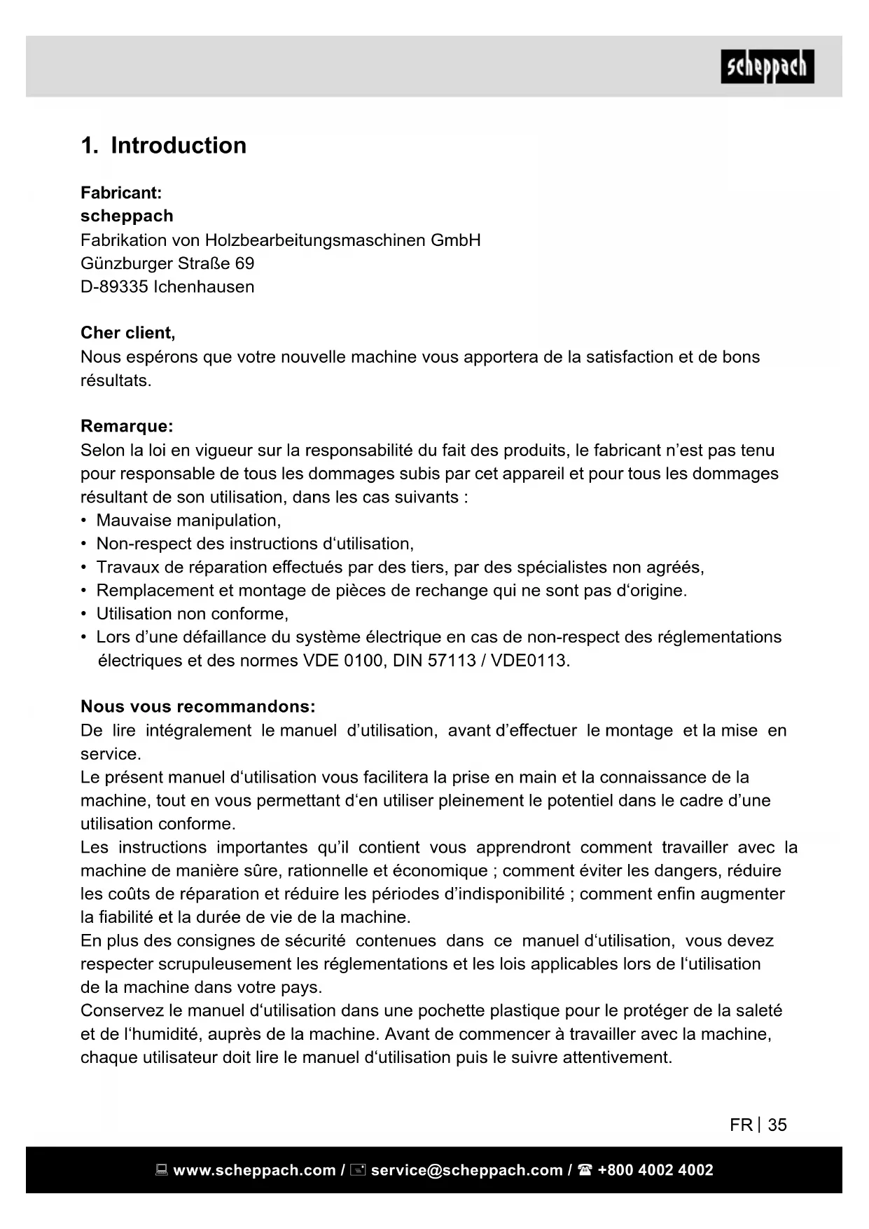 - Lors d’une défaillance du système électrique en cas de non-respect des réglementations électriques et des normes VDE 0100, DIN 57113 / VDE0113. Nous vous recommandons: De lire intégralement le manuel d’utilisation, avant d’eectuer le montage et la mise en service. Le présent manuel d‘utilisation vous facilitera la prise en main et la connaissance de la machine, tout en vous permettant d‘en utiliser pleinement le potentiel dans le cadre d’une utilisation conforme. Les instructions importantes qu’il contient vous apprendront comment travailler avec la machine de manière sûre, rationnelle et économique ; comment éviter les dangers, réduire les coûts de réparation et réduire les périodes d’indisponibilité ; comment enn augmenter la abilité et la durée de vie de la machine. En plus des consignes de sécurité contenues dans ce manuel d‘utilisation, vous devez respecter scrupuleusement les réglementations et les lois applicables lors de l‘utilisation de la machine dans votre pays. Conservez le manuel d‘utilisation dans une pochette plastique pour le protéger de la saleté et de l‘humidité, auprès de la machine. Avant de commencer à travailler avec la machine, chaque utilisateur doit lire le manuel d‘utilisation puis le suivre attentivement. www.scheppach.com / service@scheppach.com / +800 4002 4002