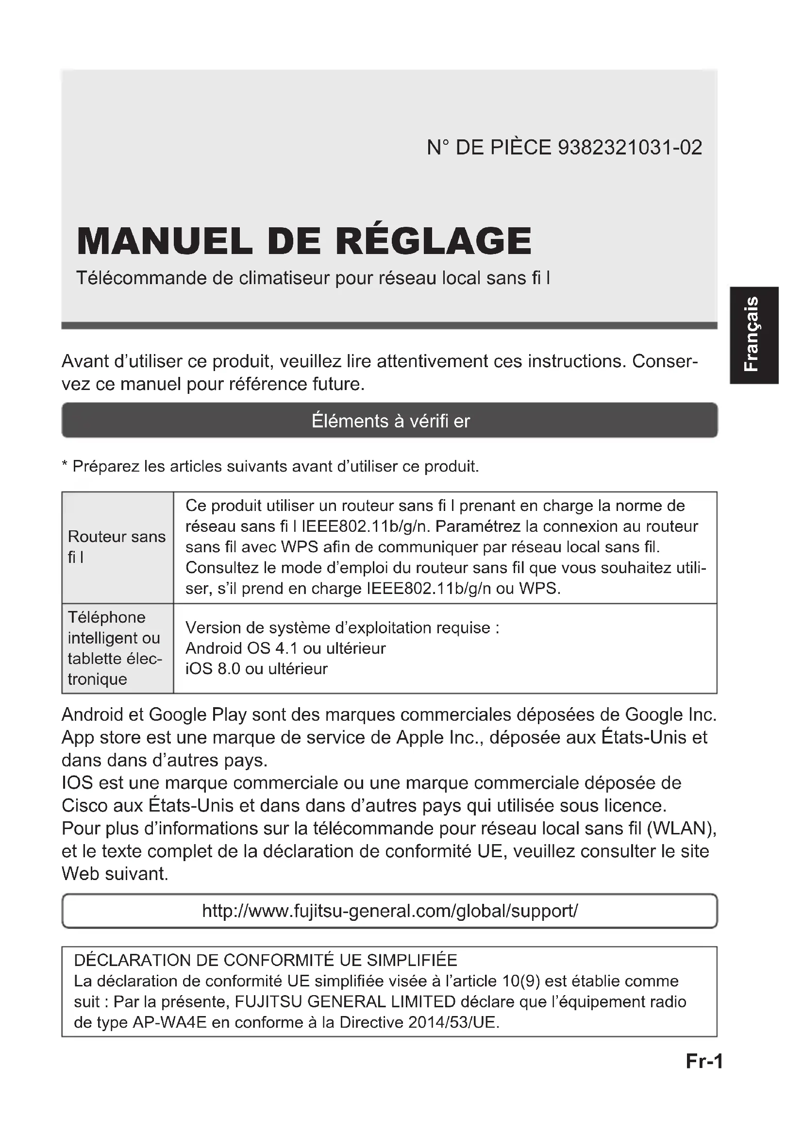 - Préparez les articles suivants avant d’utiliser ce produit. Routeur sans fi l Ce produit utiliser un routeur sans fi l prenant en charge la norme de réseau sans fi l IEEE802.11b/g/n. Paramétrez la connexion au routeur sans fi l avec WPS afi n de communiquer par réseau local sans fi l. Consultez le mode d’emploi du routeur sans fi l que vous souhaitez utili- ser, s’il prend en charge IEEE802.11b/g/n ou WPS. Téléphone intelligent ou tablette élec- tronique Version de système d’exploitation requise : Android OS 4.1 ou ultérieur iOS 8.0 ou ultérieur Android et Google Play sont des marques commerciales déposées de Google Inc. App store est une marque de service de Apple Inc., déposée aux États-Unis et dans dans d’autres pays. IOS est une marque commerciale ou une marque commerciale déposée de Cisco aux États-Unis et dans dans d’autres pays qui utilisée sous licence. Pour plus d’informations sur la télécommande pour réseau local sans fi l (WLAN), et le texte complet de la déclaration de conformité UE, veuillez consulter le site Web suivant. http://www.fujitsu-general.com/global/support/ DÉCLARATION DE CONFORMITÉ UE SIMPLIFIÉE La déclaration de conformité UE simplifi ée visée à l’article 10(9) est établie comme suit : Par la présente, FUJITSU GENERAL LIMITED déclare que l’équipement radio de type AP-WA4E en conforme à la Directive 2014/53/UE.