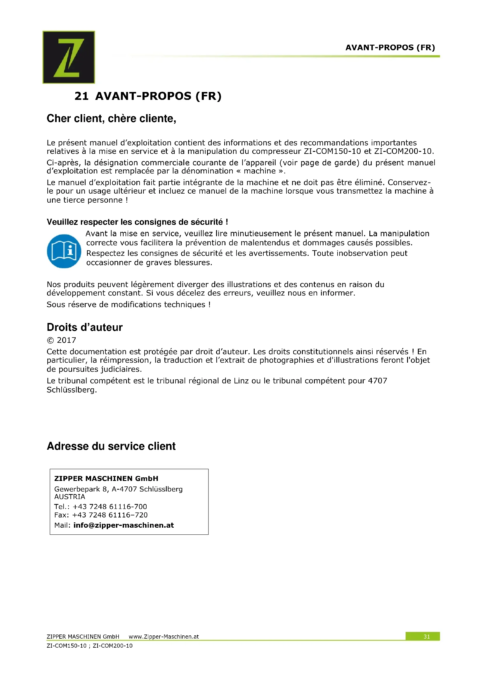 21 AVANT-PROPOS (FR) Cher client, chère cliente, Le présent manuel d’exploitation contient des informations et des recommandations importantes relatives à la mise en service et à la manipulation du compresseur ZI-COM150-10 et ZI-COM200-10. Ci-après, la désignation commerciale courante de l’appareil (voir page de garde) du présent manuel d’exploitation est remplacée par la dénomination « machine ». Le manuel d’exploitation fait partie intégrante de la machine et ne doit pas être éliminé. Conservez- le pour un usage ultérieur et incluez ce manuel de la machine lorsque vous transmettez la machine à une tierce personne ! Veuillez respecter les consignes de sécurité ! Avant la mise en service, veuillez lire minutieusement le présent manuel. La manipulation correcte vous facilitera la prévention de malentendus et dommages causés possibles. Respectez les consignes de sécurité et les avertissements. Toute inobservation peut occasionner de graves blessures. Nos produits peuvent légèrement diverger des illustrations et des contenus en raison du développement constant. Si vous décelez des erreurs, veuillez nous en informer. Sous réserve de modifications techniques ! Droits d’auteur © 2017 Cette documentation est protégée par droit d’auteur. Les droits constitutionnels ainsi réservés ! En particulier, la réimpression, la traduction et l’extrait de photographies et d'illustrations feront l'objet de poursuites judiciaires. Le tribunal compétent est le tribunal régional de Linz ou le tribunal compétent pour 4707 Schlüsslberg.