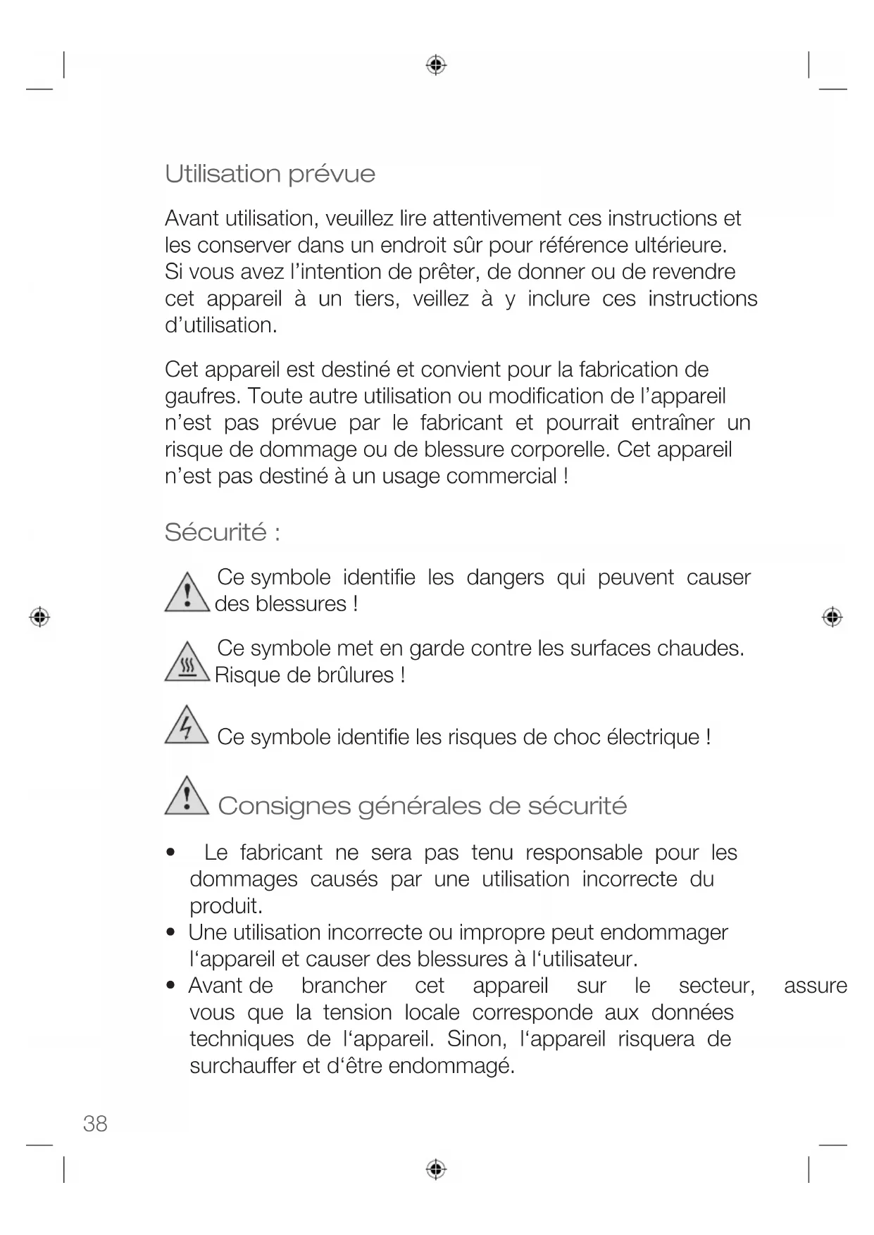- voorschadeveroorzaaktdoordeeigenaar Dezegarantieheeftgeeninvloedopdewettelijkerechtendie ualsklantkunthebbenonderdevankrachtzijndenationale wetgeving inzake de aankoop van goederen. Deklantmoet,omzichtijdensdegarantieperiodeopzijn/ haar garantierecht te beroepen, bewijs geven van de aankoopdatum (aankoopbon). De garantie kan worden ingesteld tegen KORONA electric GmbH, Sundern /Duitsland. Serviceadres: KORONA Service, Am Steinbach 9, 59872 Meschede- Enste, Duitsland Telefoon: 02933 90284-80 Mail: service@korona-electric.de web: www.korona-electric.de binnen2jaarvanafdeaankoopdatum.Deklantheeftingeval van garantie het recht om het apparaat te laten repareren in onzewinkelofbijeenandereerkendewinkel.Erworden(op grond van de garantie) geen verdere rechten aan de klant gegeven.38 Utilisation prévue Avant utilisation, veuillez lire attentivement ces instructions et les conserver dans un endroit sûr pour référence ultérieure. Si vous avez l’intention de prêter, de donner ou de revendre cet appareil à un tiers, veillez à y inclure ces instructions d’utilisation. Cet appareil est destiné et convient pour la fabrication de gaufres. Toute autre utilisation ou modification de l’appareil n’est pas prévue par le fabricant et pourrait entraîner un risque de dommage ou de blessure corporelle. Cet appareil n’est pas destiné à un usage commercial ! Sécurité : Ce symbole identifie les dangers qui peuvent causer des blessures ! Ce symbole met en garde contre les surfaces chaudes. Risque de brûlures ! Ce symbole identifie les risques de choc électrique ! Consignes générales de sécurité