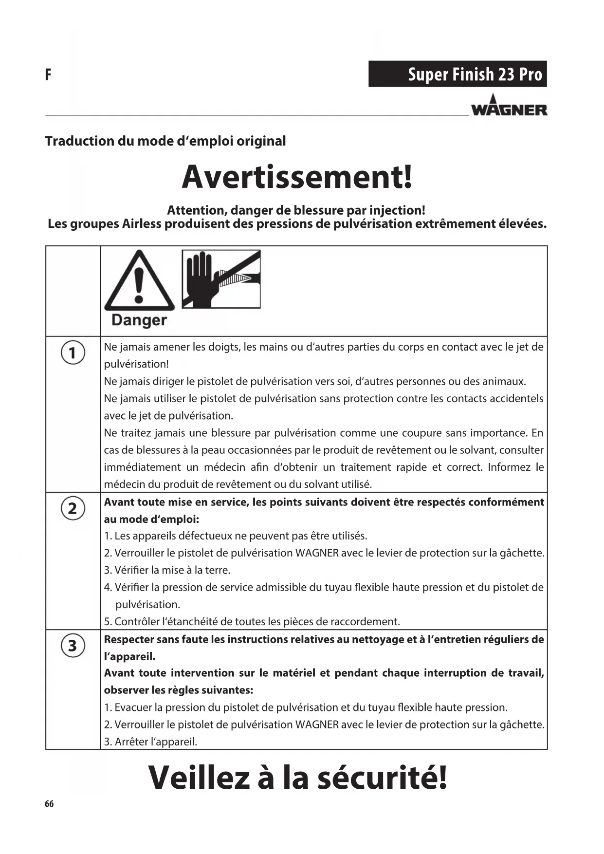 Ne jamais amener les doigts, les mains ou d‘autres parties du corps en contact avec le jet de pulvérisation!Ne jamais diriger le pistolet de pulvérisation vers soi, d‘autres personnes ou des animaux.Ne jamais utiliser le pistolet de pulvérisation sans protection contre les contacts accidentels avec le jet de pulvérisation.Ne traitez jamais une blessure par pulvérisation comme une coupure sans importance. En cas de blessures à la peau occasionnées par le produit de revêtement ou le solvant, consulter immédiatement un médecin an d‘obtenir un traitement rapide et correct. Informez le médecin du produit de revêtement ou du solvant utilisé. Avant toute mise en service, les points suivants doivent être respectés conformément au mode d‘emploi:1. Les appareils défectueux ne peuvent pas être utilisés.2. Verrouiller le pistolet de pulvérisation WAGNER avec le levier de protection sur la gâchette.3. Vérier la mise à la terre.4. Vérier la pression de service admissible du tuyau exible haute pression et du pistolet de pulvérisation.5. Contrôler l‘étanchéité de toutes les pièces de raccordement. Respecter sans faute les instructions relatives au nettoyage et à l‘entretien réguliers de l‘appareil.Avant toute intervention sur le matériel et pendant chaque interruption de travail, observer les règles suivantes:1. Evacuer la pression du pistolet de pulvérisation et du tuyau exible haute pression.2. Verrouiller le pistolet de pulvérisation WAGNER avec le levier de protection sur la gâchette.3. Arrêter l‘appareil. Veillez à la sécurité! Traduction du mode d‘emploi original67 Super Finish 23 Pro