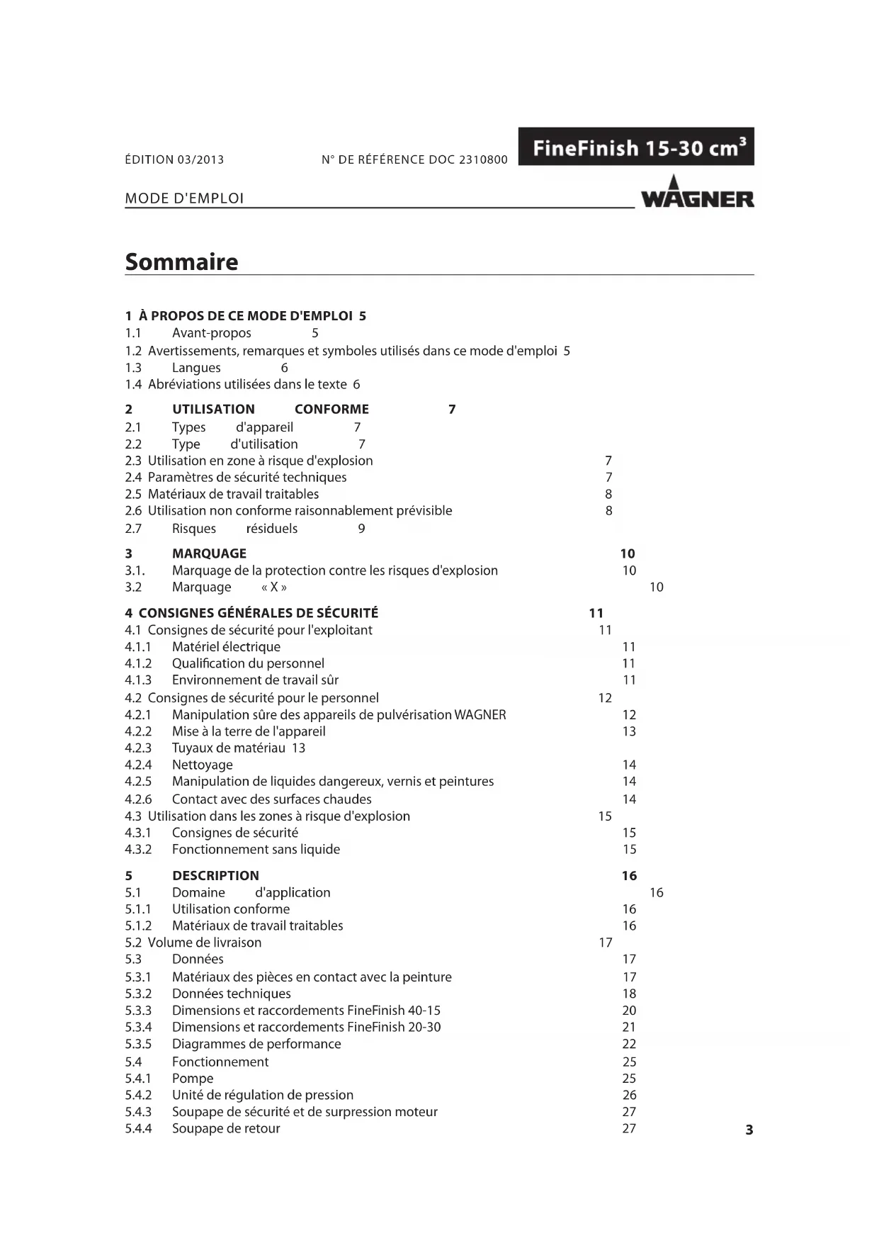 WAGNER décline toute responsabilité pour les dommages découlant d'une utilisation non conforme. L'appareil peut uniquement être utilisé pour le traitement de matériaux recommandés par WAGNER. Utiliser l'appareil en tant qu'appareil complet. Ne pas mettre les dispositifs de protection hors service. Utiliser uniquement des pièces de rechange et accessoires d'origine WAGNER. L'utilisation de la pompe pneumatique est exclusivement autorisée dans les conditions suivantes: Les opérateurs doivent auparavant avoir été formés de manière adéquate à l'aide de ce mode d'emploi. Les consignes de sécurité présentées dans ce mode d'emploi doivent être respectées. Les consignes de fonctionnement, maintenance et mise en état de ce mode d'emploi doivent être respectées. Les dispositions et règlements sur la prévention des accidents en vigueur dans le pays de l'utilisateur doivent être respectés.8 MODE D'EMPLOI ÉDITION 03/2013 N° DE RÉFÉRENCE DOC 2310800