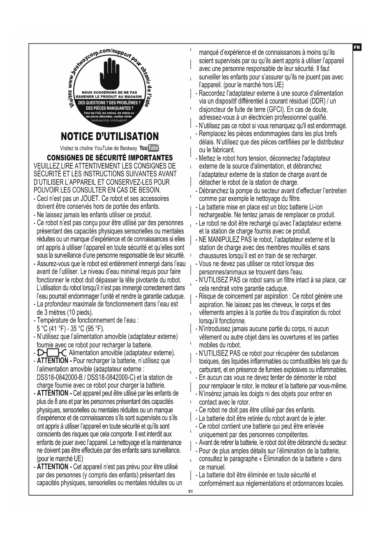 SÉCURITÉ ET LES INSTRUCTIONS SUIVANTES AVANT D’UTILISER L’APPAREIL ET CONSERVEZ-LES POUR POUVOIR LES CONSULTER EN CAS DE BESOIN. - Ceci n’est pas un JOUET. Ce robot et ses accessoires doivent être conservés hors de portée des enfants. - Ne laissez jamais les enfants utiliser ce produit. - Ce robot n’est pas conçu pour être utilisé par des personnes présentant des capacités physiques sensorielles ou mentales réduites ou un manque d’expérience et de connaissances si elles ont appris à utiliser l’appareil en toute sécurité et qu’elles sont sous la surveillance d’une personne responsable de leur sécurité. - Assurez-vous que le robot est entièrement immergé dans l’eau avant de l’utiliser. Le niveau d’eau minimal requis pour faire fonctionner le robot doit dépasser la tête pivotante du robot. L’utilisation du robot lorsqu’il n’est pas immergé correctement dans l’eau pourrait endommager l’unité et rendre la garantie caduque. - La profondeur maximale de fonctionnement dans l’eau est de 3 mètres (10 pieds). - Température de fonctionnement de l’eau : 5 °C (41 °F) - 35 °C (95 °F). - N’utilisez que l’alimentation amovible (adaptateur externe) fournie avec ce robot pour recharger la batterie. - Alimentation amovible (adaptateur externe). - ATTENTION - Pour recharger la batterie, n’utilisez que l’alimentation amovible (adaptateur externe : DSS18-0842000-B / DSS18-0842000-C) et la station de charge fournie avec ce robot pour charger la batterie. - ATTENTION - Cet appareil peut être utilisé par les enfants de plus de 8 ans et par les personnes présentant des capacités physiques, sensorielles ou mentales réduites ou un manque d’expérience et de connaissances s’ils sont supervisés ou s’ils ont appris à utiliser l’appareil en toute sécurité et qu’ils sont conscients des risques que cela comporte. Il est interdit aux enfants de jouer avec l’appareil. Le nettoyage et la maintenance ne doivent pas être effectués par des enfants sans surveillance. (pour le marché UE) - ATTENTION - Cet appareil n’est pas prévu pour être utilisé par des personnes (y compris des enfants) présentant des capacités physiques, sensorielles ou mentales réduites ou un manqué d’expérience et de connaissances à moins qu’ils soient supervisés par ou qu’ils aient appris à utiliser l’appareil avec une personne responsable de leur sécurité. Il faut surveiller les enfants pour s’assurer qu’ils ne jouent pas avec l’appareil. (pour le marché hors UE) - Raccordez l’adaptateur externe à une source d'alimentation via un dispositif différentiel à courant résiduel (DDR) / un disjoncteur de fuite de terre (GFCI). En cas de doute, adressez-vous à un électricien professionnel qualifié. - N’utilisez pas ce robot si vous remarquez qu'il est endommagé. - Remplacez les pièces endommagées dans les plus brefs délais. N’utilisez que des pièces certifiées par le distributeur ou le fabricant. - Mettez le robot hors tension, déconnectez l'adaptateur externe de la source d'alimentation, et débranchez l’adaptateur externe de la station de charge avant de détacher le robot de la station de charge. - Débranchez la pompe du secteur avant d’effectuer l’entretien comme par exemple le nettoyage du filtre. - La batterie mise en place est un bloc batterie Li-ion rechargeable. Ne tentez jamais de remplacer ce produit. - Le robot ne doit être rechargé qu’avec l’adaptateur externe et la station de charge fournis avec ce produit. - NE MANIPULEZ PAS le robot, l’adaptateur externe et la station de charge avec des membres mouillés et sans chaussures lorsqu’il est en train de se recharger. - Vous ne devez pas utiliser ce robot lorsque des personnes/animaux se trouvent dans l'eau. - N’UTILISEZ PAS ce robot sans un filtre intact à sa place, car cela rendrait votre garantie caduque. - Risque de coincement par aspiration : Ce robot génère une aspiration. Ne laissez pas les cheveux, le corps et des vêtements amples à la portée du trou d’aspiration du robot lorsqu’il fonctionne. - N’introduisez jamais aucune partie du corps, ni aucun vêtement ou autre objet dans les ouvertures et les parties mobiles du robot. - N’UTILISEZ PAS ce robot pour récupérer des substances toxiques, des liquides inflammables ou combustibles tels que du carburant, et en présence de fumées explosives ou inflammables. - En aucun cas vous ne devez tenter de démonter le robot pour remplacer le rotor, le moteur et la batterie par vous-même. - N’insérez jamais les doigts ni des objets pour entrer en contact avec le rotor. - Ce robot ne doit pas être utilisé par des enfants. - La batterie doit être retirée du robot avant de le jeter. - Ce robot contient une batterie qui peut être enlevée uniquement par des personnes compétentes.