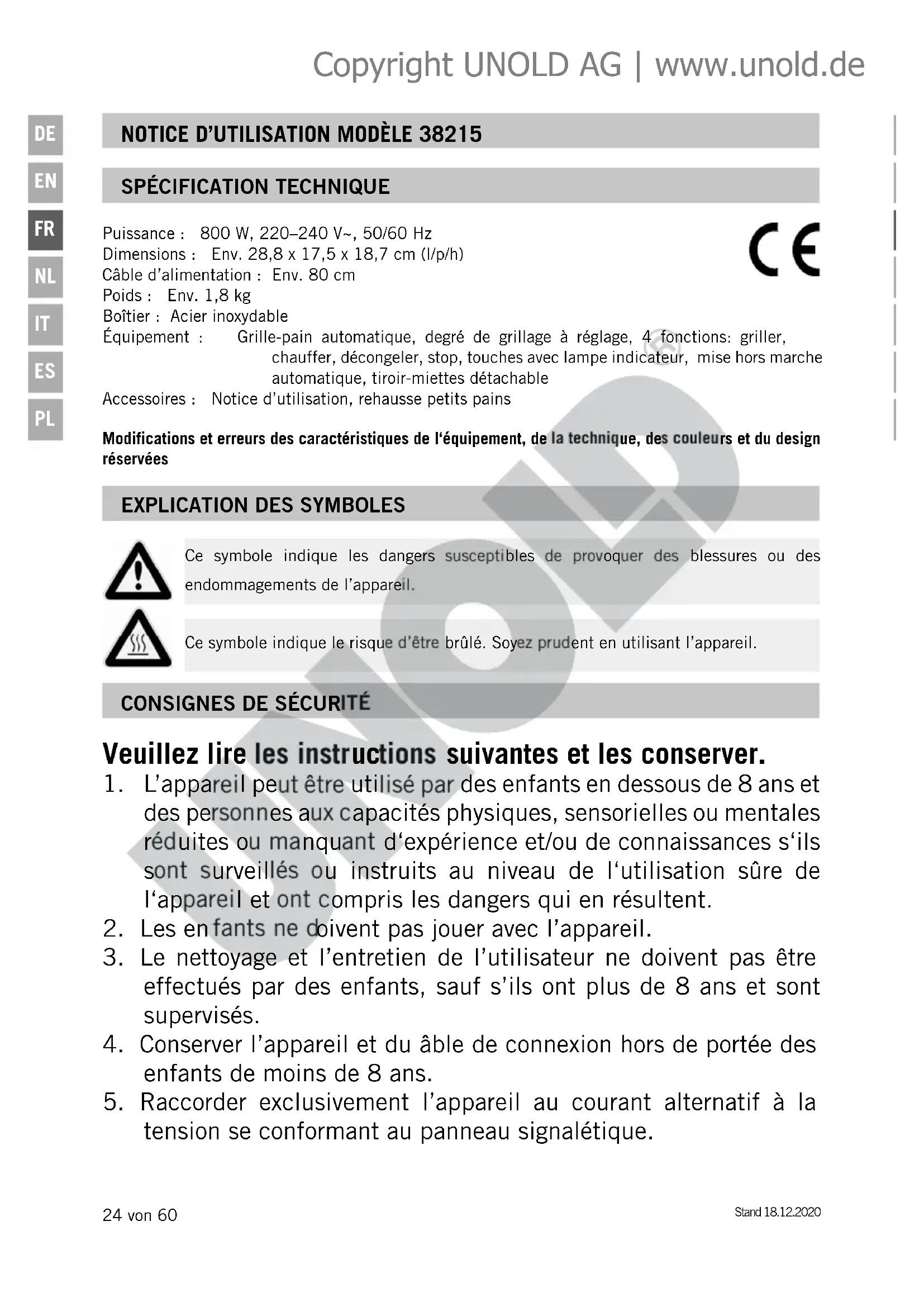 faites-le remplacer par le fabricant ou son service après-vente ou bien par une personne qualifiée, pour éviter des risques. Prudence : L’appareil est très chaud pendant son fonctionnement ! N’ouvrez en aucun cas la coque de l’appareil. Ne tenez aucun objet, e.g. cuiller, ou vos parties du corps dans la fente pour pain. Risque d‘électrocution. Le fabricant n’est nullement responsable en cas de montage non conforme, d‘utilisation irrégulière ou non conforme ou suite à l’exécution de réparations par des tiers non autorisés. Copyright UNOLD AG | www.unold.deStand 18.12.2020 27 von 60