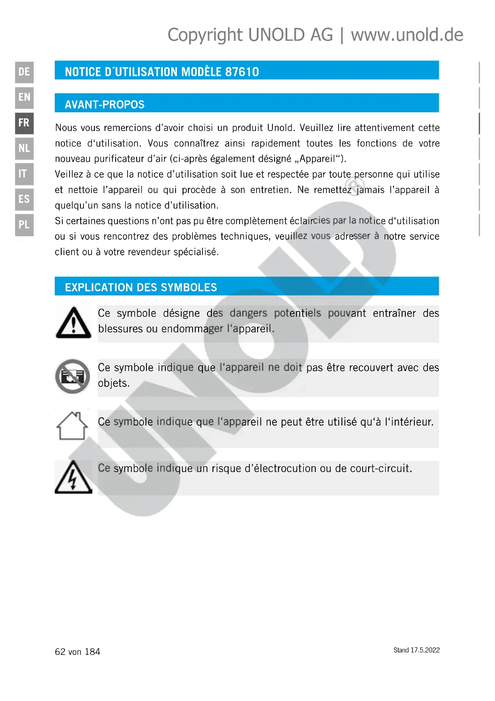 Erreur Solution L'appareil ne fonctionne pas alors que la prise de l‘appareil est branchée Le voyant de contrôle de changement des filtres s'allume, mais les filtres ne sont pas remplacés. L'appareil ne fonctionne alors plus. Remplacez les filtres et réinitialisez le compteur d'intervalles. Le flux d'air de la sortie d'air est plus faible que d'habitude Le préfiltre est sale. Nettoyer le préfiltre Même après une longue période de fonctionnement, la qualité de l‘air ne s‘améliore pas Vérifiez que les deux filtres ont été insérés correctement. Le capteur est humide, ce qui peut arriver lorsque l’humidité de l’air dans la pièce est élevée. Séchez soigneusement le capteur. Le voyant de contrôle de la qualité de l'air ne change plus de couleur Le capteur est sale. Nettoyez le capteur. L‘appareil dégage une odeur inhabituelle C’est normal à la première utilisation de l‘appareil. Les odeurs désagréables peuvent également provenir des filtres s’ils sont sales. Nettoyer ou remplacer les filtres. S‘il y a une odeur de brûlé, débranchez l‘appareil de l‘alimentation électrique, arrêtez de l‘utiliser et contactez le service clients. Le voyant de contrôle du changement de filtre s'allume bien que les filtres ont été changés Le compteur d'intervalles doit être réinitialisé. Pour cela, appuyez sur la touche "Timer" pendant 3 secondes. L'appareil ne fonctionne plus, "E-1" apparaît à l'écran Moteur abîmé, contactez le service clients. Copyright UNOLD AG | www.unold.deStand 17.5.2022 85 von 184