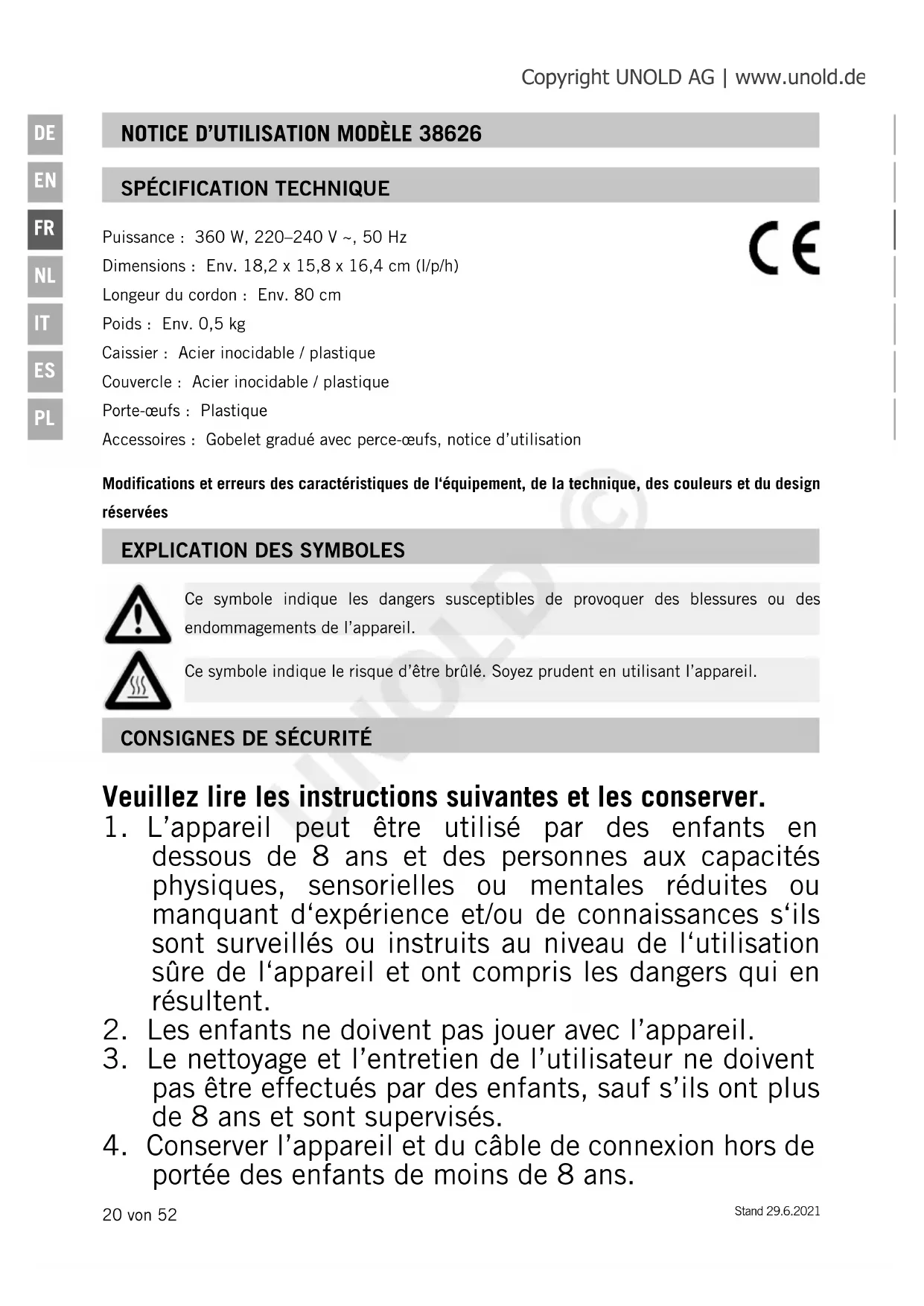 Ce symbole indique les dangers susceptibles de provoquer des blessures ou des endommagements de l’appareil. Ce symbole indique le risque d’être brûlé. Soyez prudent en utilisant l’appareil. Copyright UNOLD AG | www.unold.de UNOLD ©Stand 29.6.2021 21 von 52