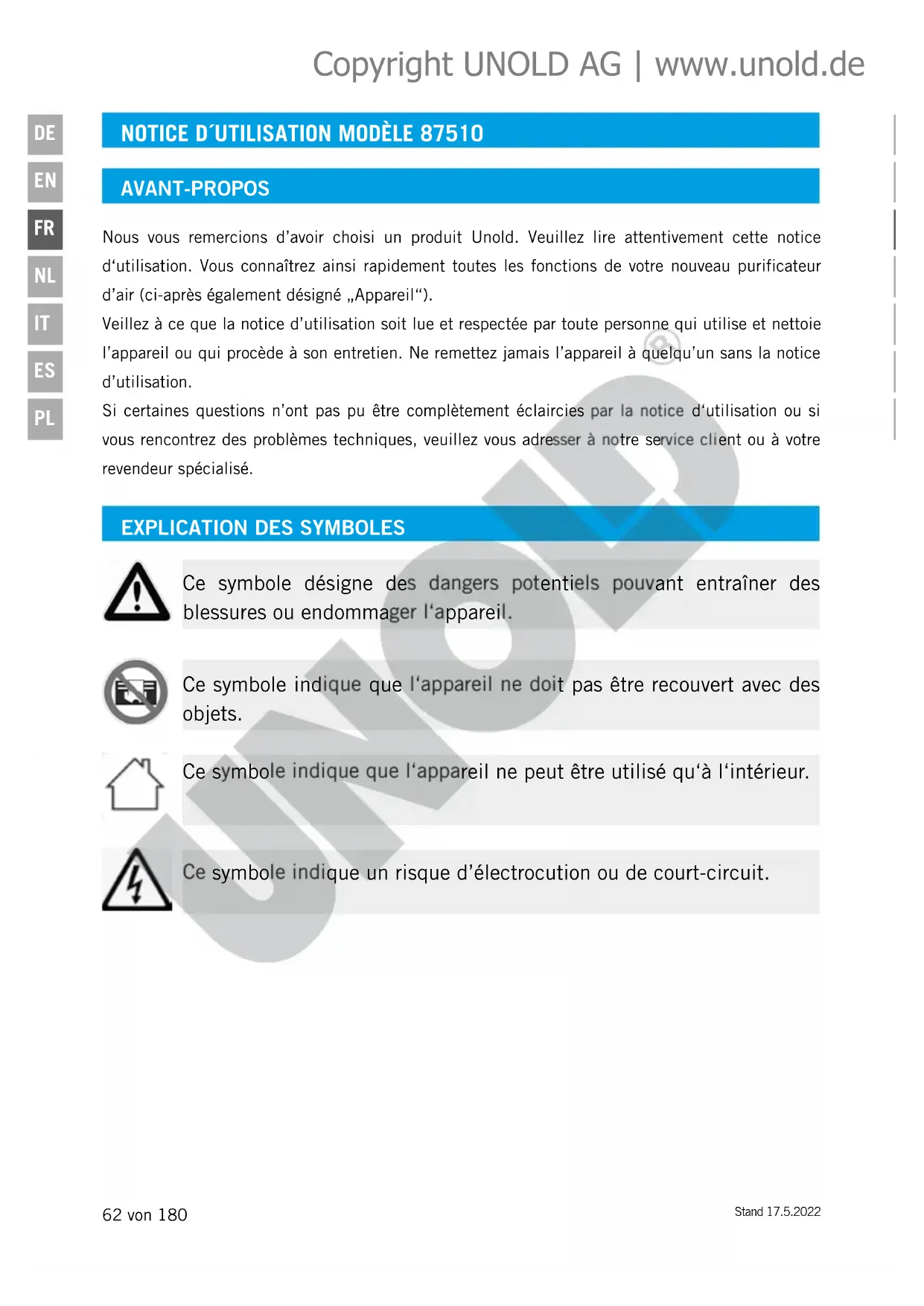 Ce symbole désigne des dangers potentiels pouvant entraîner des blessures ou endommager l‘appareil. Ce symbole indique un risque d’électrocution ou de court-circuit. Ce symbole indique que l‘appareil ne doit pas être recouvert avec des objets. Ce symbole indique que l‘appareil ne peut être utilisé qu‘à l‘intérieur. Copyright UNOLD AG | www.unold.deStand 17.5.2022 63 von 180