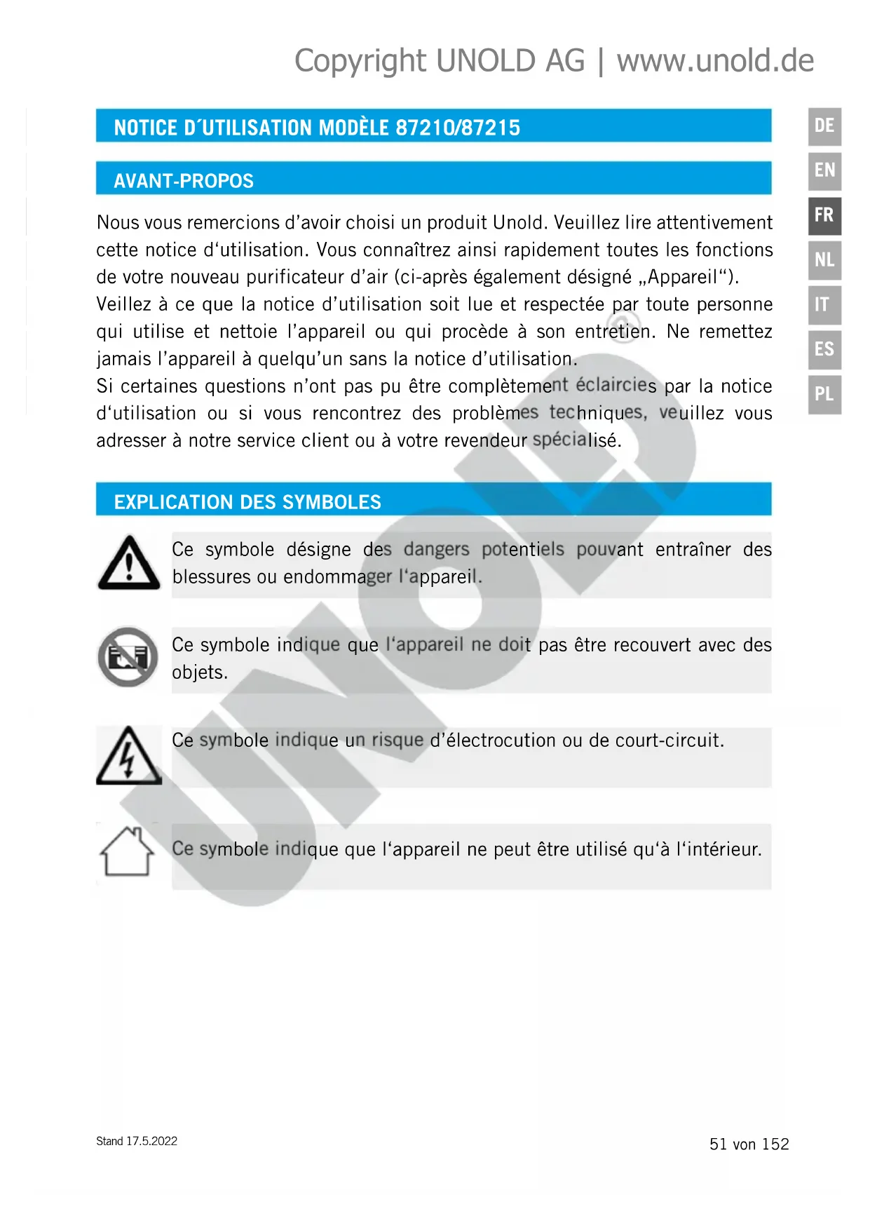 ni le radon. Il ne doit pas être utilisé pour la purification de l‘air après des accidents avec des résidus de combustion ou des produits chimiques. Copyright UNOLD AG | www.unold.de56 von 152 Stand 17.5.2022