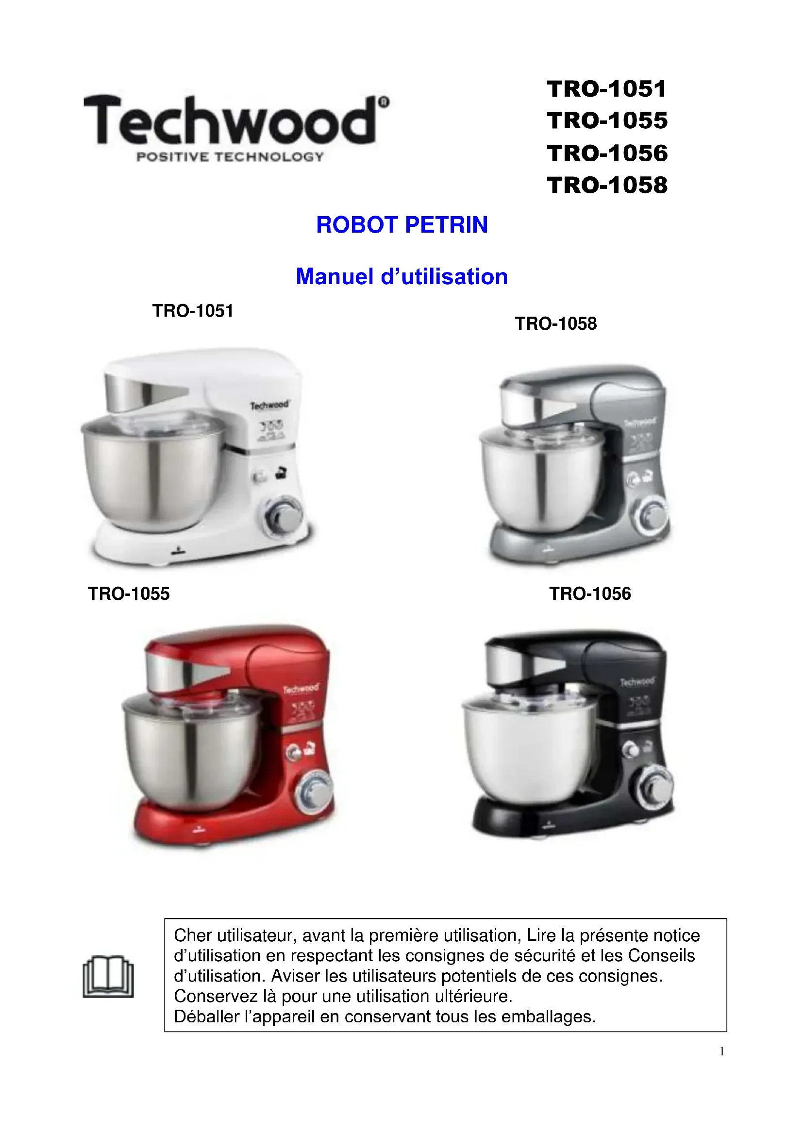 ROBOT PETRIN Manuel d’utilisation TRO-1051 TRO-1055 TRO-1056 TRO-1058 Cher utilisateur, avant la première utilisation, Lire la présente notice d’utilisation en respectant les consignes de sécurité et les Conseils d’utilisation. Aviser les utilisateurs potentiels de ces consignes. Conservez là pour une utilisation ultérieure. Déballer l’appareil en conservant tous les emballages.