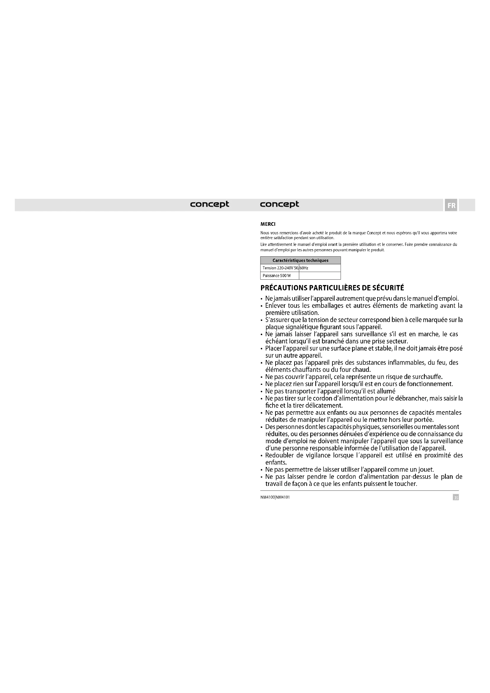 NM4100|NM4101 MERCI Nous vous remercions d’avoir acheté le produit de la marque Concept et nous espérons qu’il vous apportera votre entière satisfaction pendant son utilisation. Lire attentivement le manuel d’emploi avant la première utilisation et le conserver. Faire prendre connaissance du manuel d’emploi par les autres personnes pouvant manipuler le produit. Caractéristiques techniques Tension 220-240V 50/60Hz Puissance 500 W PRÉCAUTIONS PARTICULIÈRES DE SÉCURITÉ