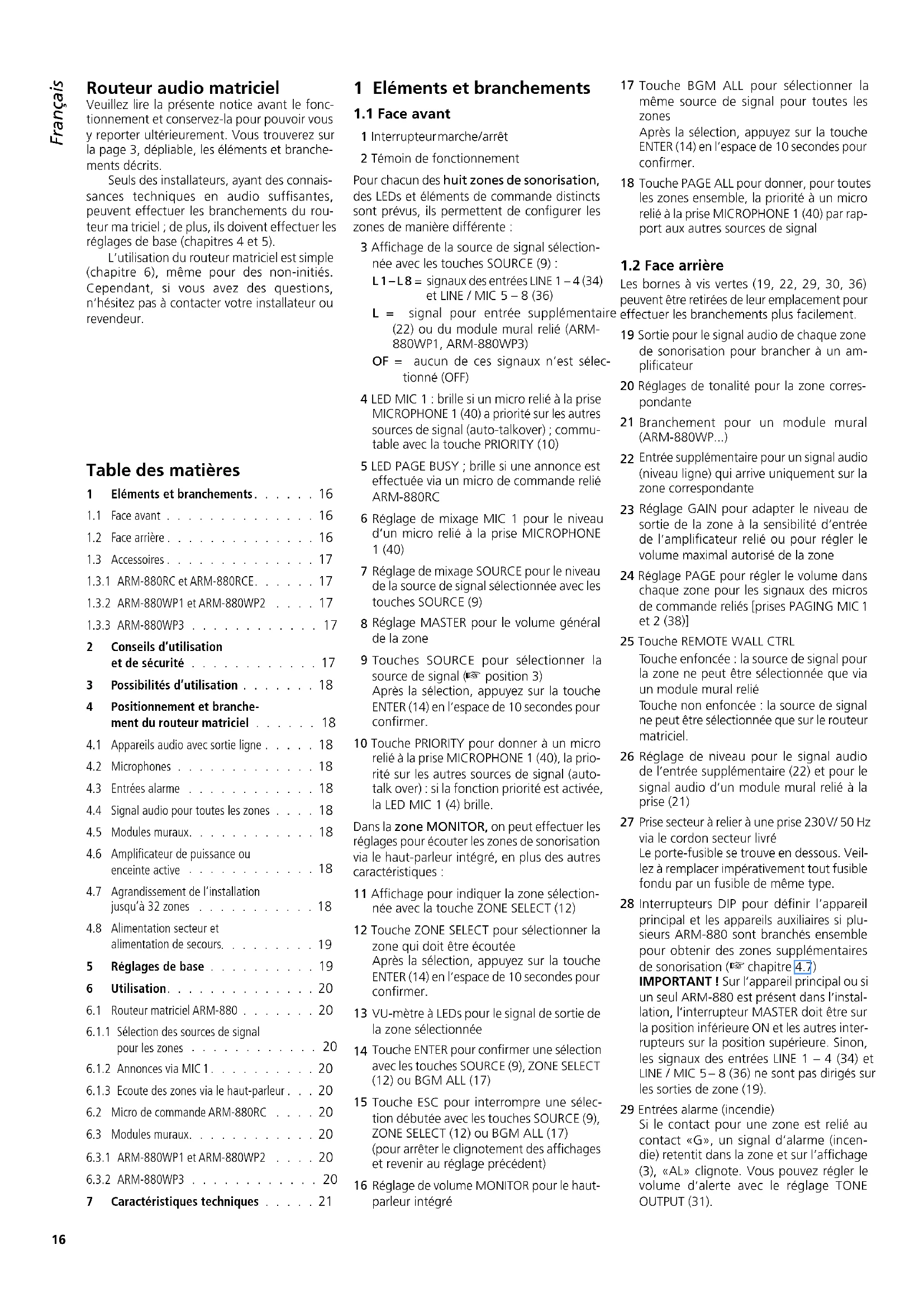 INTERNATIONAL GmbH & Co. KG. No part of this instruction manual may be reproduced in any form or by any means for any commercial use.16 DeutschDeutsch SeiteInhaltEnglishEnglish PageContentsItalianoItaliano PaginaIndiceEspañolEspañol PáginaContenidosNederlandsNederlands PaginaInhoudPolskiPolski StronaSpis treści Routeur audio matriciel Veuillez lire la présente notice avant le fonc- tionnement et conservez-la pour pouvoir vous y reporter ultérieurement. Vous trouverez sur la page 3, dépliable, les éléments et branche- ments décrits. Seuls des installateurs, ayant des connais- sances techniques en audio suffisantes, peuvent effectuer les branchements du rou- teur ma triciel ; de plus, ils doivent effectuer les réglages de base (chapitres 4 et 5). L’utilisation du routeur matriciel est simple (chapitre 6), même pour des non-initiés. Cependant, si vous avez des questions, n’hésitez pas à contacter votre installateur ou revendeur. 1 Eléments et branchements