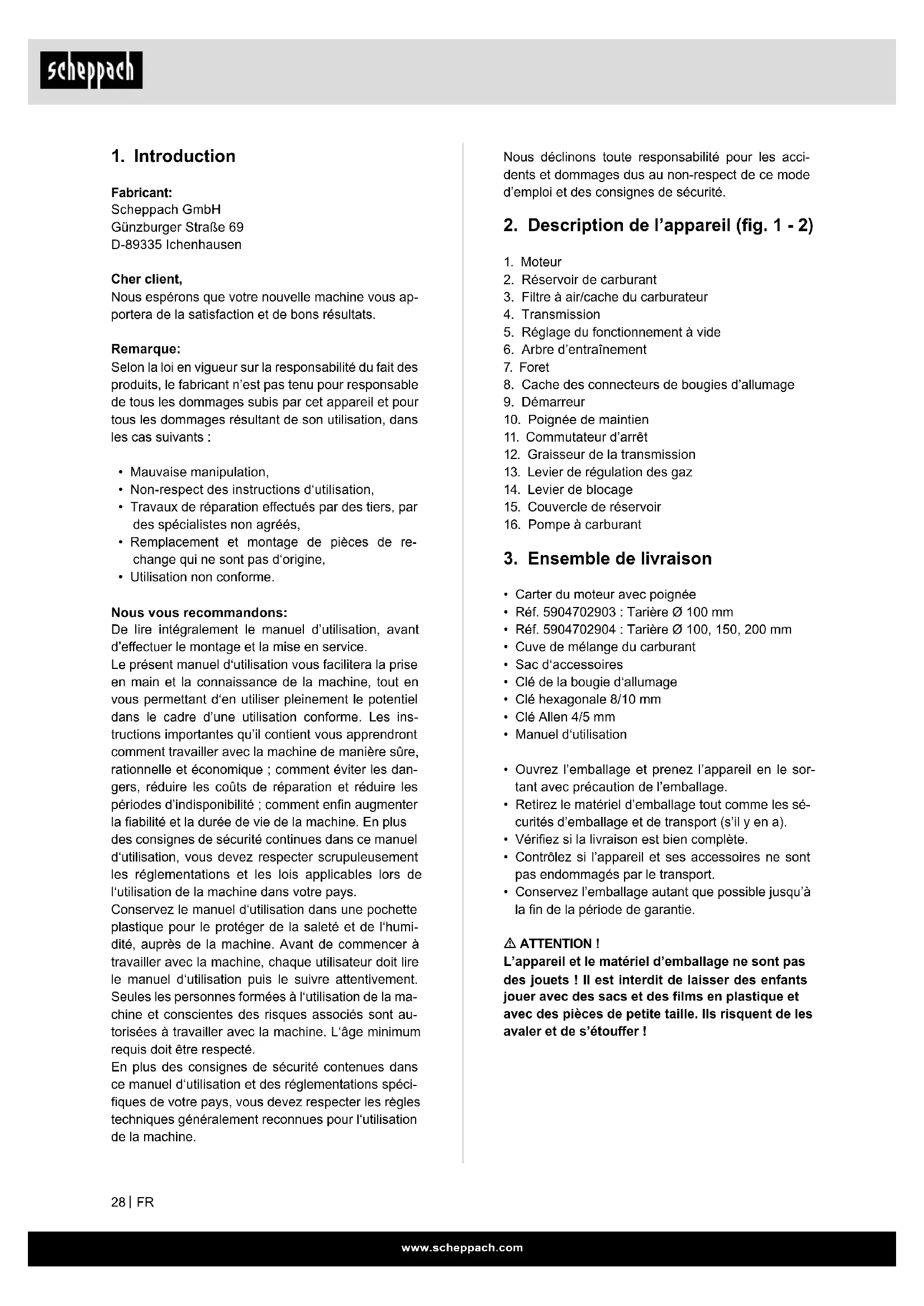 Fabricant: Scheppach GmbH Günzburger Straße 69 D-89335 Ichenhausen Cher client, Nous espérons que votre nouvelle machine vous ap- portera de la satisfaction et de bons résultats. Remarque: Selon la loi en vigueur sur la responsabilité du fait des produits, le fabricant n’est pas tenu pour responsable de tous les dommages subis par cet appareil et pour tous les dommages résultant de son utilisation, dans les cas suivants :