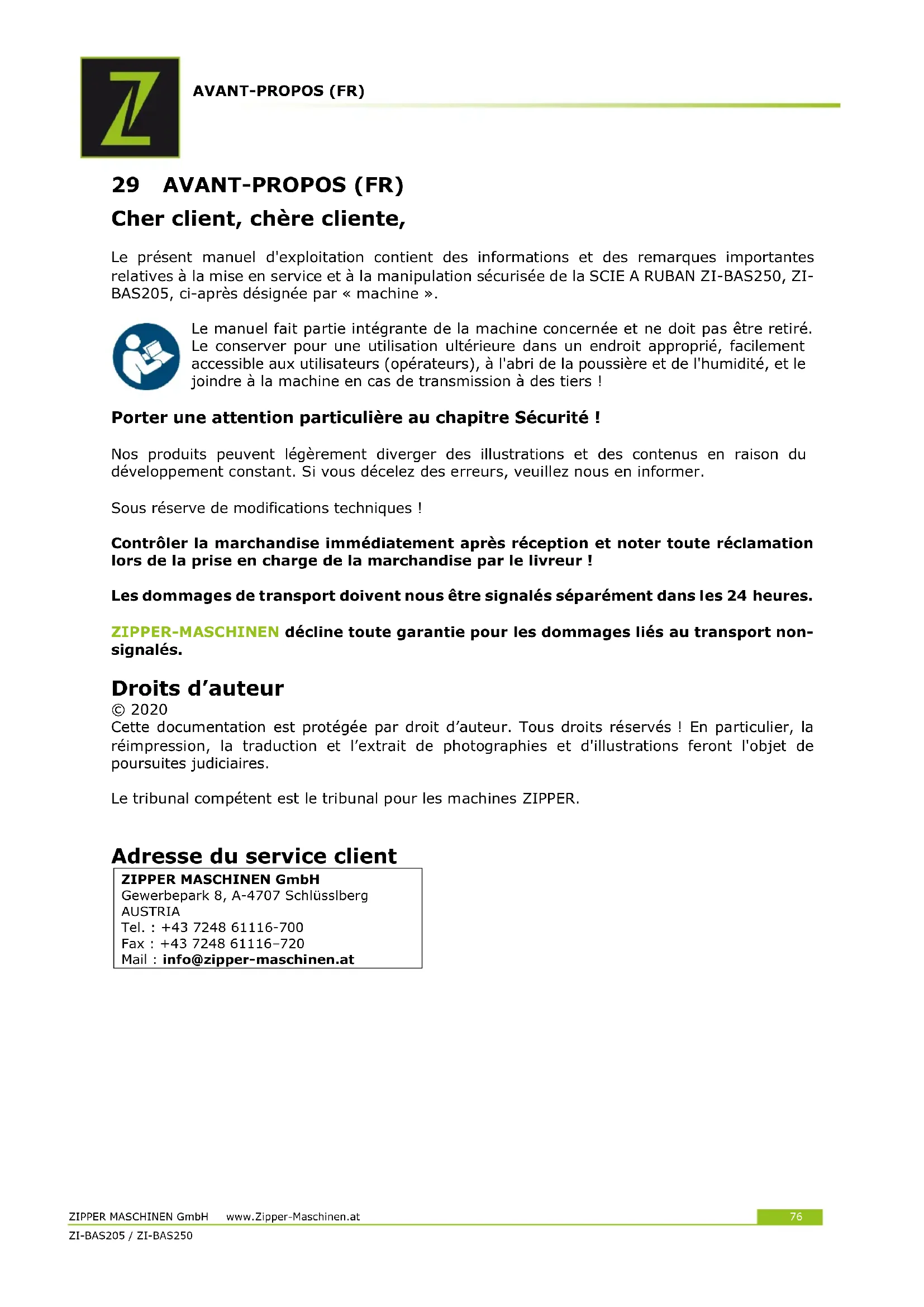 sierra siguiendo las indicaciones en las instrucciones de usoAVANT-PROPOS (FR) ZIPPER MASCHINEN GmbH www.Zipper-Maschinen.at 76 ZI-BAS205 / ZI-BAS25076 29 AVANT-PROPOS (FR) Cher client, chère cliente, Le présent manuel d'exploitation contient des informations et des remarques importantes relatives à la mise en service et à la manipulation sécurisée de la SCIE A RUBAN ZI-BAS250, ZI- BAS205, ci-après désignée par « machine ». Le manuel fait partie intégrante de la machine concernée et ne doit pas être retiré. Le conserver pour une utilisation ultérieure dans un endroit approprié, facilement accessible aux utilisateurs (opérateurs), à l'abri de la poussière et de l'humidité, et le joindre à la machine en cas de transmission à des tiers ! Porter une attention particulière au chapitre Sécurité ! Nos produits peuvent légèrement diverger des illustrations et des contenus en raison du développement constant. Si vous décelez des erreurs, veuillez nous en informer. Sous réserve de modifications techniques ! Contrôler la marchandise immédiatement après réception et noter toute réclamation lors de la prise en charge de la marchandise par le livreur ! Les dommages de transport doivent nous être signalés séparément dans les 24 heures. ZIPPER-MASCHINEN décline toute garantie pour les dommages liés au transport non- signalés. Droits d’auteur © 2020 Cette documentation est protégée par droit d’auteur. Tous droits réservés ! En particulier, la réimpression, la traduction et l’extrait de photographies et d'illustrations feront l'objet de poursuites judiciaires. Le tribunal compétent est le tribunal pour les machines ZIPPER.